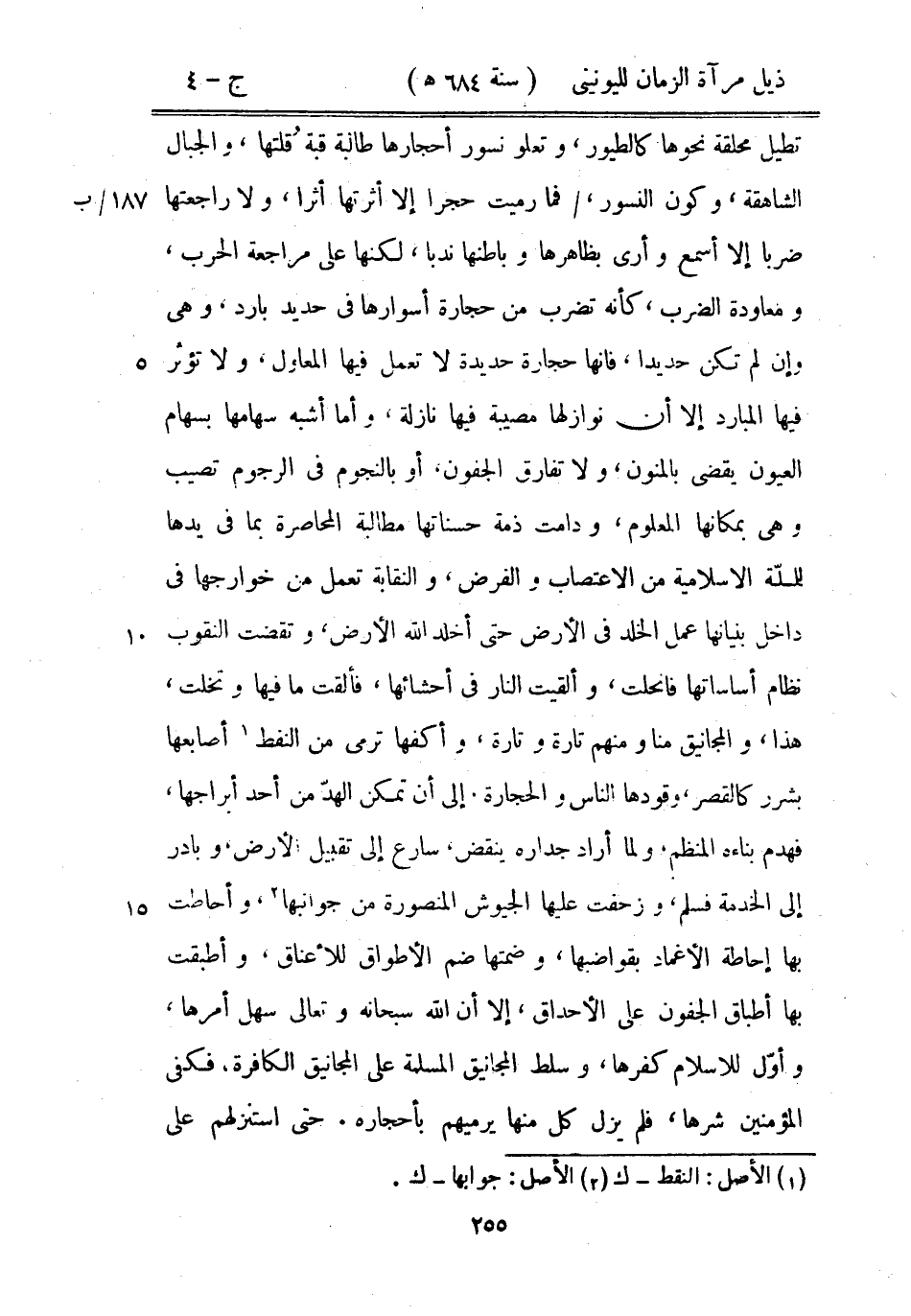 تطيل محلقة نحوها كالطيور، وتعلو نسور أحجارها طالبة قبة قلتها، والجبال الشاهقة، وكون النسور، فما رميت حجراً إلا أثرتها أثراً، ولا راجعتها ضرباً إلا أسمع وأرى بظاهرها وباطنها ندباً، لكنها على مراجعة الحرب، ومعاودة الضرب، كأنه تضرب من حجارة أسوارها في حديد بارد، وهي وإن لم تكن حديداً، فإنها حجارة حديدة لا تعمل فيها المعاول، ولا تؤثر فيها المبارد إلا أن نوازلها مصيبة فيها نازلة، وأما أشبه سهامها بسهام العيون يقضي بالمنون، ولا تفارق الجفون، أو بالنجوم في الرجوم تصيب وهي بمكانها المعلوم، ودامت ذمة حسناتها مطالبة المحاصرة بما في يدها للملة الإسلامية من الاعتصاب والفرض، والنقابة تعمل من خوارجها في داخل بنيانها عمل الخلد في الأرض حتى أخلد الله الأرض، وتقضت النقوب نظام أساساتها فانحلت، وألقيت النار في أحشائها، فألقت ما فيها وتخلت، هذا، والمجانيق منا ومنهم تارة وتارة، وأكفها ترمي من النفط أصابعها بشرر كالقصر، وقودها الناس والحجارة، إلى أن تمكن الهد من أحد أبراجها، فهدم بناءه المنظم، ولما أراد جداره ينقض، سارع إلى تقبيل الأرض، وبادر إلى الخدمة فسلم، وزحفت عليها الجيوش المنصورة من جوانبها، وأحاطت بها إحاطة الأغماد بقواضبها، وضمتها ضم الأطواق للأعناق، وأطبقت بها إطباق الجفون على الأحداق، إلا أن الله سبحانه وتعالى سهل أمرها، وأول الإسلام كفرها، وسلط المجانيق المسلمة على المجانيق الكافرة، فكفى المؤمنين شرها، فلم يزل كل منها يرميهم بأحجاره. حتى استنزلهم على