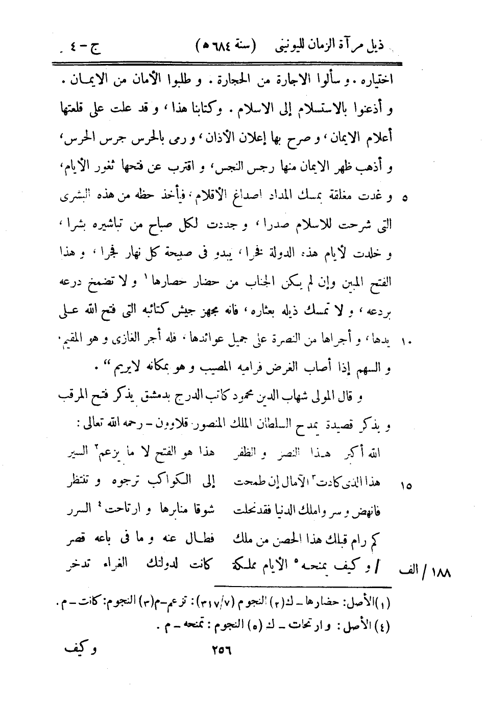 اختياره. وسألوا الإجارة من الحجارة. وطلبوا الأمان من الإيمان. وأذعنوا بالاستسلام إلى الإسلام. وكتابنا هذا، وقد علت على قلعتها أعلام الإيمان، وصرح بها إعلان الأذان، ورمى بالحرس رجس الحرس، وأذهب ظهر الإيمان منها جرس النجس، واقترب عن فتحها ثغور الأيام، وغدت مغلقة بمسك المداد أصداغ الأقلام، فيأخذ حظه من هذه البشرى التي شرحت للإسلام صدراً، وجددت لكل صباح من تباشيره بشراً، وخلدت لأيام هذه الدولة فخراً، يبدو في صبيحة كل نهار فجراً، وهذا الفتح المبين وإن لم يكن الجناب من حضار حصارها ولا تضمخ درعه بردعه، ولا تمسك ذيله بعثاره، فإنه مجهز جيش كتائبه التي فتح الله على يدها، وأجراها من النضرة على جميل عوائدها، فله أجر الغازي وهو المقيم، والسهم إذ أصاب الغرض فراميه المصيب وهو بمكانه لا يريم ".