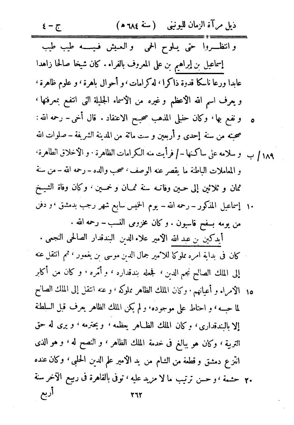 إسماعيل بن إبراهيم بن علي المعروف بالفراء. كان شيخاً صالحاً زاهداً عابداً ورعاً ناسكاً قدوة ذاكراً، له كرامات، وأحوال باهرة، وعلوم ظاهرة، ويعرف اسم الله الأعظم وغيره من الأسماء الجليلة التي انتفع بمعرفتها، ونفع بها، وكان حنبلي المذهب صحيح الاعتقاد. قال أخي رحمه الله: صحبته من سنة إحدى وأربعين وست ومائة من المدينة الشريفة صلوات الله وسلامه على ساكنها فرأيت منه الكرامات الظاهرة، والأخلاق الطاهرة، والمعاملات الباطنة ما يقصر عنه الوصف، صحب والده رحمه الله من سنة ثمان وثلاثين إلى حين وفاته سنة ثمان وخمسين، وكان وفاة الشيخ إسماعيل المذكور رحمه الله يوم الخميس سابع شهر رجب بدمشق، ودفن من يومه بسفح قاسيون. وكان مخزومي النسب رحمه الله.