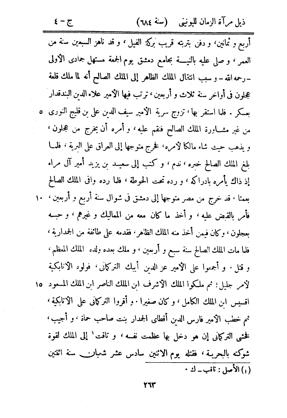 أربع وثمانين، ودفن بتربته قريب بركة الفيل، وقد ناهز السبعين سنة من العمر، وصلى عليه بالنية بجامع دمشق يوم الجمعة مستهل جمادى الأولى رحمه الله وسبب انتقال الملك الظاهر إلى لملك الصالح أنه لما ملك قلعة عجلون في أواخر سنة ثلاث وأربعين، ترتب فيها الأمير علاء الدين البندقدار بعسكر. فلما استقر بها، تزوج سرية الأمير سيف الدين علي بن قليج النوري من غير مشاورة الملك الصالح فنقم عليه، وأمره أن يخرج من عجلون، ويذهب حيث شاء مالكاً لأمره، فخرج متوجهاً إلى العراق على البرية، فلما بلغ الملك الصالح خبره، ندم، وكتب إلى سعيد بن يزيد أمير آل مراء إذ ذاك يأمره بإدراكه، ورده تحت الحوطة، فلما رده وافى الملك الصالح بعمتا، قد خرج من مصر متوجهاً إلى دمشق في شوال سنة أربع وأربعين، فأمر بالقبض عليه، وأخذ ما كان معه من المماليك وغيرهم، وحبسه بعجلون، وكان فيمن أخذ منه الملك الظاهر، فقدمه على طائفة من الجمدارية، فلما مات الملك الصالح سنة سبع وأربعين، وملك بعد ولده الملك المعظم، وقتل، وأجمعوا على الأمير عز الدين أيبك التركماني، فولوه الأتابكية لأمر جليل؛ ثم ملكوا الملك الأشرف ابن الملك الناصر ابن الملك المسعود أقسيس ابن الملك الكامل، وكان صغيراً. وأقروا التركماني على الأتابكية، ثم خطب الأمير فارس الدين أقطاي الجمدار بنت صاحب حماة، وأجيب، فخشي التركماني إن هو دخل بها عظمت نفسه، وتاقت إلى الملك لقوة شوكته بالبحرية، فقتله يوم الاثنين سادس عشر شعبان سنة اثنتين