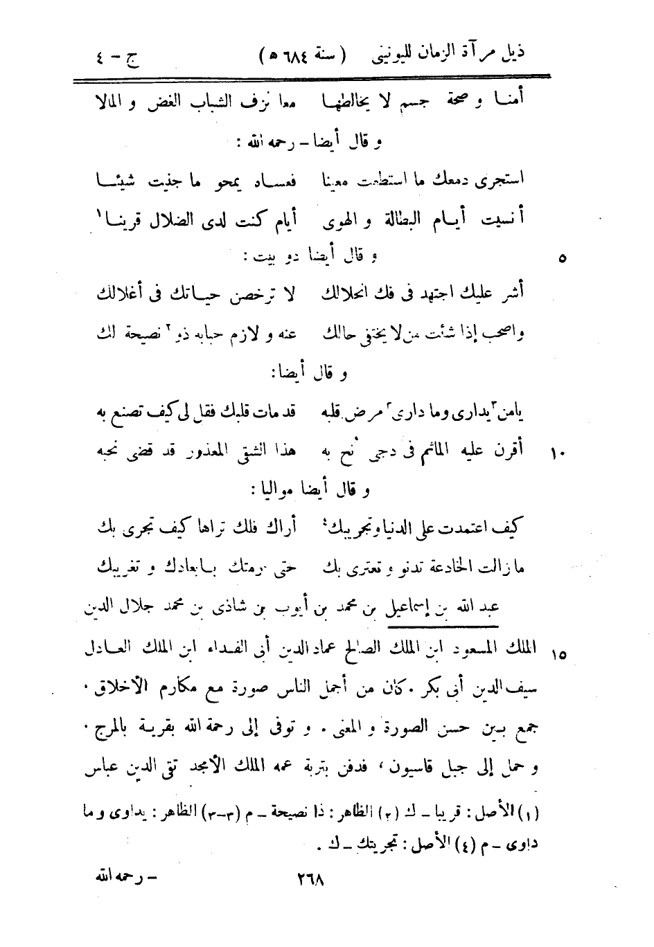 عبد الله بن إسماعيل بن محمد بن أيوب بن شاذي بن محمد جلال الدين الملك المسعود ابن الملك الصالح عماد الدين أبي الفداء ابن الملك العادل سيف الدين أبي بكر. كان من اجمل الناس صورة مع مكارم الأخلاق، جمع بين حسن الصورة والمعنى. وتوفي إلى رحمة الله بقرية بالمرج. وحمل إلى جبل قاسيون، فدفن بتربة عمه الملك الأمجد تقي الدين عباس