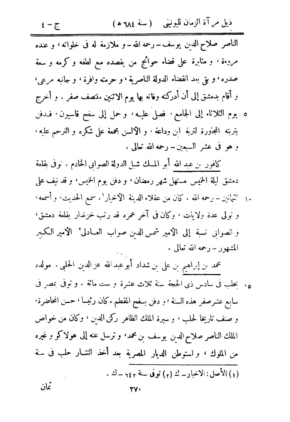 الناصر صلاح الدين يوسف رحمه الله وملازمة له في خلواته، وعنده مروءة، ومثابرة على قضاء حوائج من يقصده من لطفه وكرمه وسعة صدره، وبقي بعد انقضاء الدولة الناصرية، وحرمته وافرة، وجانبه مرعى، وأقام بدمشق إلى أن أدركته وفاته بها يوم الاثنين منتصف صفر. وأخرج يوم الثلاثاء إلى الجامع. فصلى عليه، وحمل إلى سفح قاسيون، فدفن بتربته المجاورة لتربة ابن وداعة. والألسن مجمعة على شكره والترحم عليه، وهو في عشر السبعين رحمه الله تعالى.