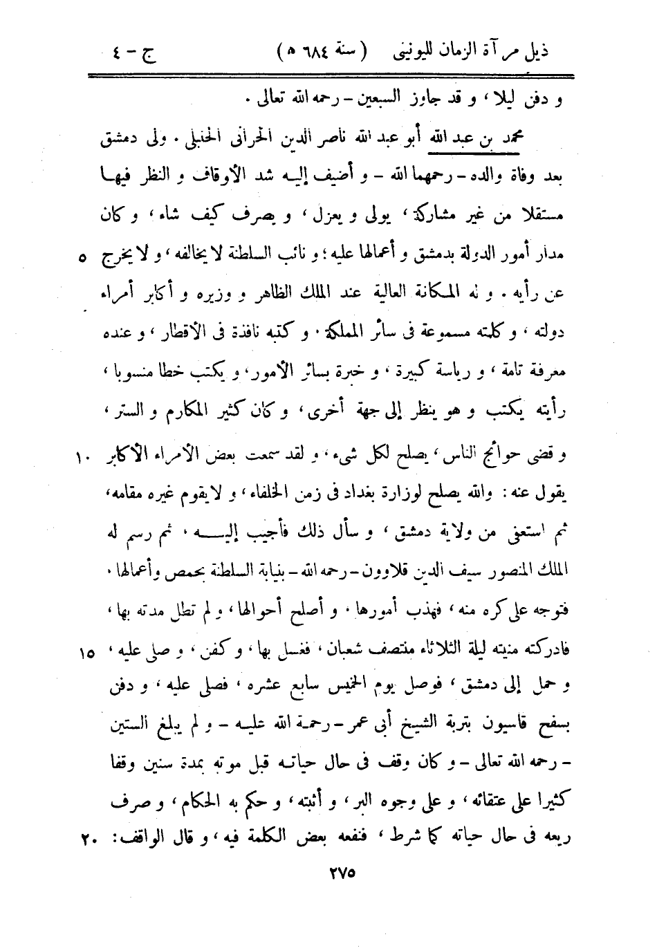 محمد بن عبد الله أبو عبد الله ناصر الدين الحراني الحنبلي. ولي دمشق بعد وفاة والده رحمهما الله وأضيف إليه شد الأوقاف والنظر فيها مستقلاً من غير مشاركة، يولي ويعزل، ويصرف كيف شاء، وكان مدار أمور الدولة بدمشق وأعمالها عليه؛ ونائب السلطنة لا يخالفه، ولا يخرج عن رأيه. وله المكانة العالية عند الملك الظاهر ووزيره وأكابر أمراء دولته، وكلمته مسموعة في سائر المملكة، وكتبه نافذة في الأقطار، وعنده معرفة تامة، ورياسة كبيرة، وخبرة بسائر الأمور، ويكتب خطاً منسوباً، رأيته يكتب وهو ينظر إلى جهة أخرى، وكان كثير المكارم والستر، وقضى حوائج الناس، يصلح لكل شيء، ولقد سمعت بعض الأمراء الأكابر يقول عنه: والله يصلح لوزارة بغداد في زمن الخلفاء، ولا يقوم غيره مقامه، ثم استعفى من ولاية دمشق، وسأل ذلك فأجيب عليه، ثم رسم له الملك المنصور سيف الدين قلاوون رحمه الله بنيابة السلطنة بحمص وأعمالها، فتوجه إلى كره منه، فهذب أمورها، وأصلح أحوالها، ولم تطل مدته بها، فأدركته منيته ليلة الثلاثاء منتصف شعبان، فغسل بها، وكفن، وصلي عليه، وحمل إلى دمشق، فوصل يوم الخميس سابع عشره، فصلي عليه، ودفن بسفح قاسيون بتربة الشيخ أبي عمر رحمة الله عليه ولم يبلغ الستين رحمه الله تعالى وكان وقف في حال حياته قبل موته بمدة سنين وقفاً كثيراً على عتقائه، وعلى وجوه البر، وأثبته، وحكم به الحكام، وصرف ريعه في حال حياته كما شرط، فنفعه بعض الكلمة فيه، وقال الواقف: