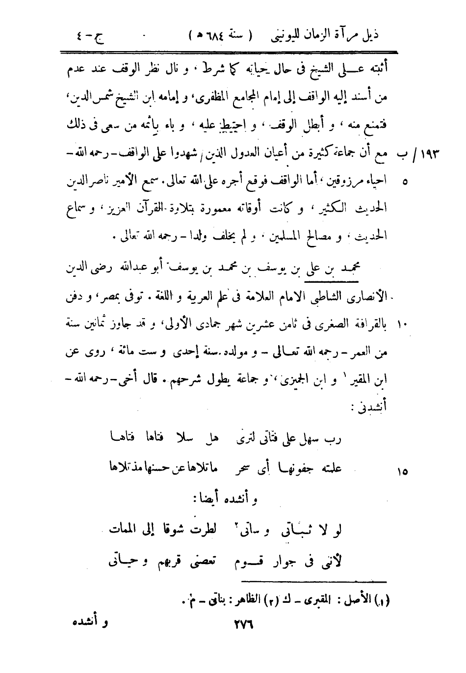 أثبته على الشيخ في حال حياته كما شرط، ونل نظر الوقف عند عدم من أسند إليه الواقف إلى الإمام المجامع المظفري، وإمامه ابن الشيخ شمس الدين، فتمنع منه، وأبطل الوقف، واحتيط عليه، وباء بإثمه من سعى في ذلك مع أن جماعة كثير من أعيان العدول الذين شهدوا على الواقف رحمه الله أحياء مرزوقين، أما الواقف فوقع أجره على الله تعالى. سمع الأمير ناصر الدين الحديث الكثير، وكانت أوقاته معمورة بتلاوة القرآن العزيز، وسماع الحديث، ومصالح المسلمين، ولم يخلف ولداً رحمه الله تعالى.