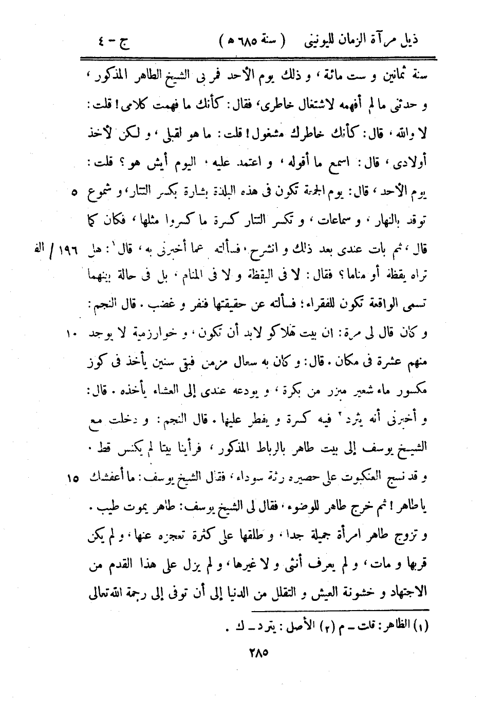 سنة ثمانين وست مائة، وذلك يوم الأحد فمر بي الشيخ الطاهر المذكور، وحدثني ما لم أفهمه لاشتغال خاطري، فقال: كأنك ما فهمت كلامي! قلت: لا والله، قال: كأنك خاطرك مشغول. قلت: ما هو لقلبي ولكل لآخذ أولادي قال: اسمع ما أقول، واعتمد عليه، اليوم أيش هو؟ قلت: يوم الأحد، قال: يوم الجمعة تكون في هذه البلدة بشارة بكسر التتار، وشموع توقد بالنهار، وسماعات، وتكسر التتار كسرة ما كسروا مثلها، فكان كما قال، ثم بات عندي بعد ذلك وانشرح، فسألته عما أخبرني به، قال: هل تراه يقظة أو مناماً؟ فقال: لا في اليقظة ولا في المنام، بل في حالة بينهما تسمى الواقعة تكون للفقراء؛ فسألته عن حقيقتها فنفر وغضب. قال النجم: وكان قال لي مرة: إن بيت هلاكو لا بد أن تكون، وخوارزمية لا يوجد منهم عشرة في مكان. قال: وكان به سعال مزمن فبقي سنين يأخذ في كوز مكسور ماء شعير مبزر من بكرة، يودعه عندي إلى العشاء يأخذه. قال: وأخبرني أنه يثرد فيه كسرة ويفطر عليها. قال النجم: ودخلت مع الشيخ يوسف إلى بيت طاهر بالرباط المذكور، فرأينا بيتاً لم يكنس قط. وقد نسج العنكبوت على حصيره رثة سوداء، فقال الشيخ يوسف: ما أعفشك يا طاهر! ثم خرج طاهر للوضوء. فقال لي الشيخ يوسف: طاهر يموت طيب. وتزوج طاهر امرأة جميلة جداً. وطلقها على كثرة تعجزه عنها، ولم يكن قربها ومات، ولم يعرف أنثى ولا غيرها، ولم يزل على هذا القدم من الاجتهاد وخشونة العيش والتقلل من الدنيا إلى أن توفي إلى رحمة الله تعالى