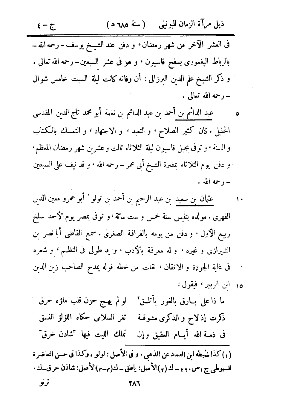 عثمان بن سعيد بن عبد الرحيم بن أحمد بن تولو أبو عمرو ومعين الدين الفهري. مولده بتنيس سنة خمس وست مائة، وتوفي بمصر يوم الأحد سلخ ربيع الأول، ودفن من يومه بالقرافة الصغرى. سمع القاضي أبا نصر بن الشيرازي وغيره، وله معرفة بالأدب، ويد طولى في النظم، وشعره في غاية الجودة والإتقان، نقلت من خطه قوله بمدح الصاحب زين الدين ابن الزبير فيقول: