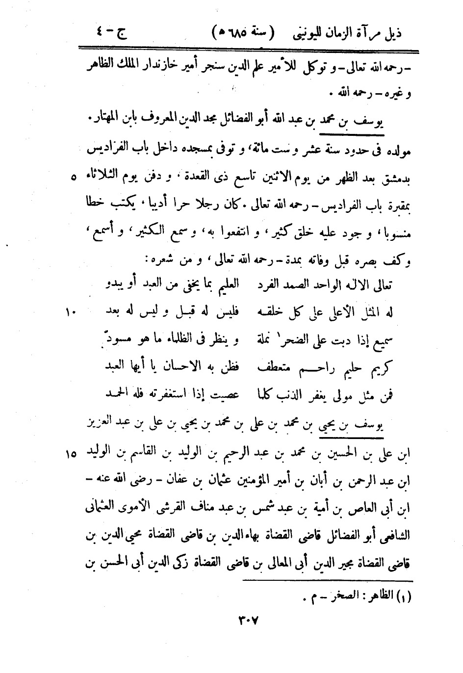 يوسف بن محمد بن عبد الله أبو الفضائل مجد الدين المعروف بابن المهتار. مولده في حدود سنة عشر وست مائة، وتوفي بمسجده داخل باب الفراديس بدمشق بعد الظهر من يوم الاثنين تاسع ذي القعدة، ودفن يوم الثلاثاء بمقبرة باب الفراديس رحمه الله تعالى. كان رجلاً حراً أديباً، يكتب خطاً منسوباً، وجود عليه خلق كثير، وانتفعوا به، وسمع الكثير، وأسمع، وكف بصره قبل وفاته بمدة رحمه الله تعالى، ومن شعره: