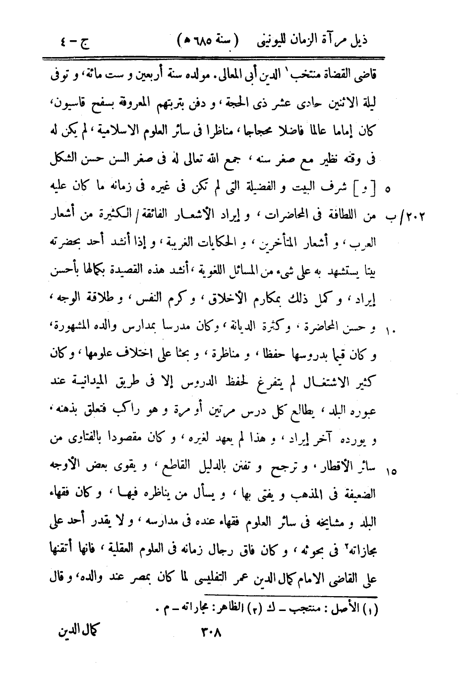 قاضي القضاة منتخب الدين أبي المعالي. مولده سنة أربعين وست مائة، وتوفي ليلة الاثنين حادي عشر ذي الحجة، ودفن بتربتهم المعروفة بسفح قاسيون، كان إماماً عالماً فاضلاً محجاجاً، مناظراً في سائر العلوم الإسلامية، لم يكن له في وقته نظير مع صغر سنه، جمع الله تعالى له في صغر السن حسن الشكل وشرف البيت والفضيلة التي لم تكن في غيره في زمانه ما كان عليه من اللطافة في المحاضرات، وإيراد الأشعار الفائقة الكثيرة من أشعار العرب، وأشعار المتأخرين، والحكايات الغريبة، وإذا أنشد أحد بحضرته بيتاً يستشهد به على شيء من المسائل اللغوية، أنشد هذه القصيدة بكاملها بأحسن إيراد، وكمل ذلك بمكارم الأخلاق، وكرم النفس وطلاقة الوجه، وحسن المحاضرة، وكثرة الديانة، وكان مدرساً بمدارس والده المشهورة، وكان قيماً بدروسها حفظاً، ومناظرة، وبحثاً على اختلاف علومها، وكان كثير الاشتغال لم يتفرغ لحفظ الدروس إلا في طريق الميدانية عند عبوره البلد، يطالع كل درس مرتين أو مرة وهو راكب فتعلق بذهنه، ويورده آخر إيراد، وهذا لم يعهد لغيره، وكان مقصوداً بالفتاوي من سائر الأقطار، وترجح وتفنن بالدليل القاطع، ويقوي بعض الأوجه الضعيفة في المذهب ويفتي بها، ويسأل من يناظره فيها، وكان فقهاء البلد ومشايخه في سائر العلوم فقهاء عنده في مدارسه، ولا يقدر أحد على مجازاته في بحوثه، وكان فاق رجال زمانه في العلوم العقلية، فإنها أتقنها على القاضي الإمام كمال الدين عمر التفليسي لما كان بمصر عند والده، وقال