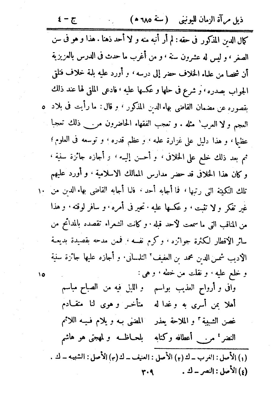 كمال الدين المذكور في حقه: لم أر أنبه منه ولا أحد ذهناً. هذا وهو في سن الصغر، وليس له عشرون سنة، ومن أغرب ما حدث في الدرس بالعزيزية أن شخصاً من علماء الخلاف حضر إلى درسه، وأورد عليه بلمة خلاف فتلقى الجواب بصدره، وشرع في حلها وعكسها عليه، فادعى الملقى لها عند ذلك بقصوره عن مضمان القاضي بهاء الدين المذكور، وقال: ما رأيت في بلاد العجم ولا العرب مثله. وتعجب الفقهاء الحاضرون من ذلك تعجباً عظيماً، وهذا دليل على غزارة علمه، وعظم قدره، وتوسعه في العلوم، ثم بعد ذلك خلع على الخلافي، وأحسن إليه، وأجازه جائزة سنية، وكان هذا الخلافي قد حضر مدارس الممالك الإسلامية، وأورد عليهم تلك النكيتة التي رتبها، فما أجابه أحد، فلما أجابه القاضي بهاء الدين من غير تفكير ولا تثبت، وعكسها عليه تحير في أمره. وسافر لوقته، وهذا من المناقب التي ما سمعت لأحد قبله. وكانت الشعراء تقصده بالمدائح من سائر الأقطار لكثرة جوائزه، وكرم نفسه، فمن مدحه بقصيدة بديعة الأديب شمس الدين محمد بن العفيف التلمساني، وأجازه عليها جائزة سنية وخلع عليه. ونقلت من خطه، وهي: