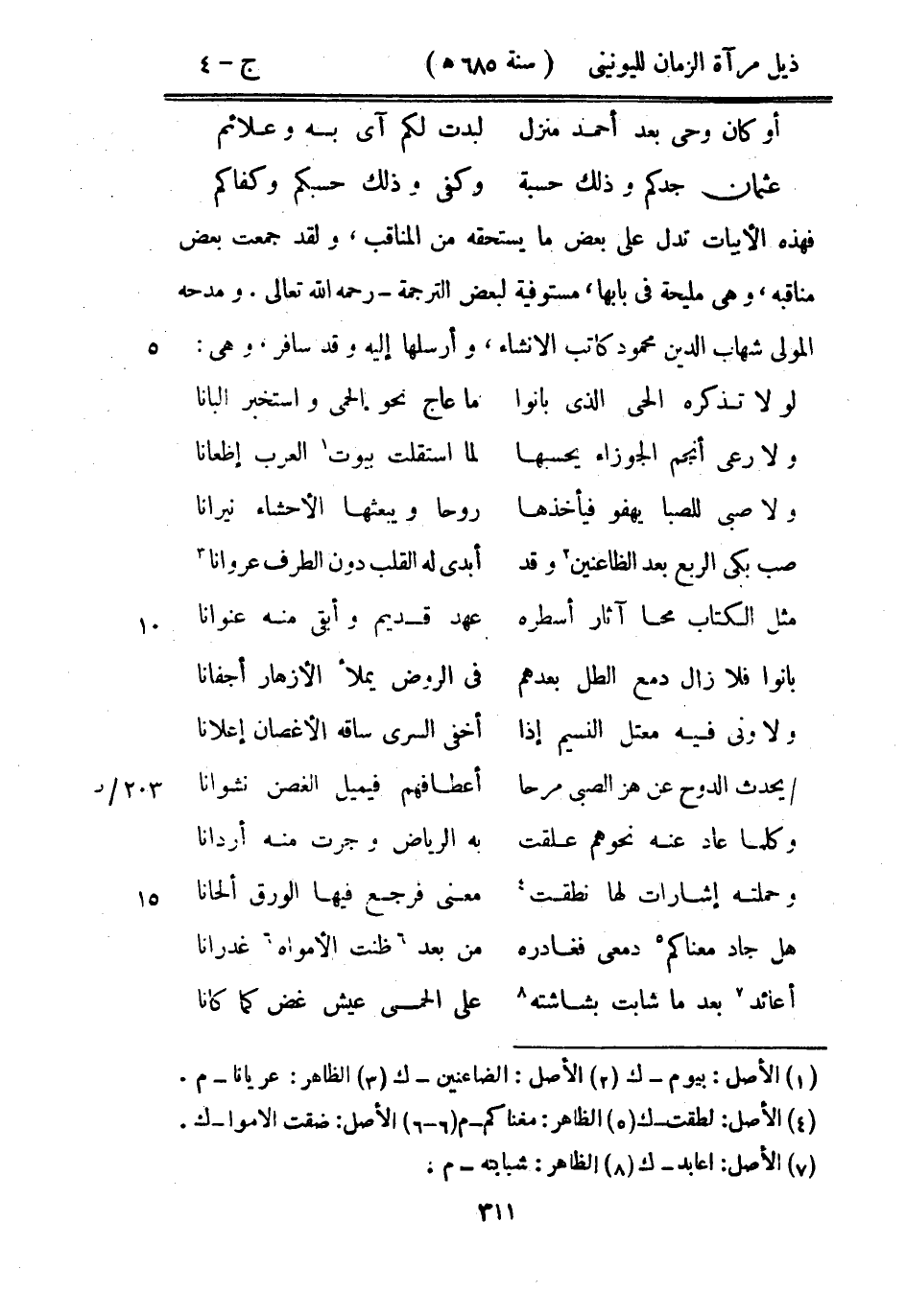 فهذه الأبيات تدل على بعض ما يستحقه من المناقب، ولقد جمعت بعض مناقبه، وهي مليحة في بابها، مستوفية لبعض الترجمة رحمه الله تعالى. ومدحه المولى شهاب الدين محمود كاتب الإنشاء، وأرسلها إليه وقد سافر، وهي: