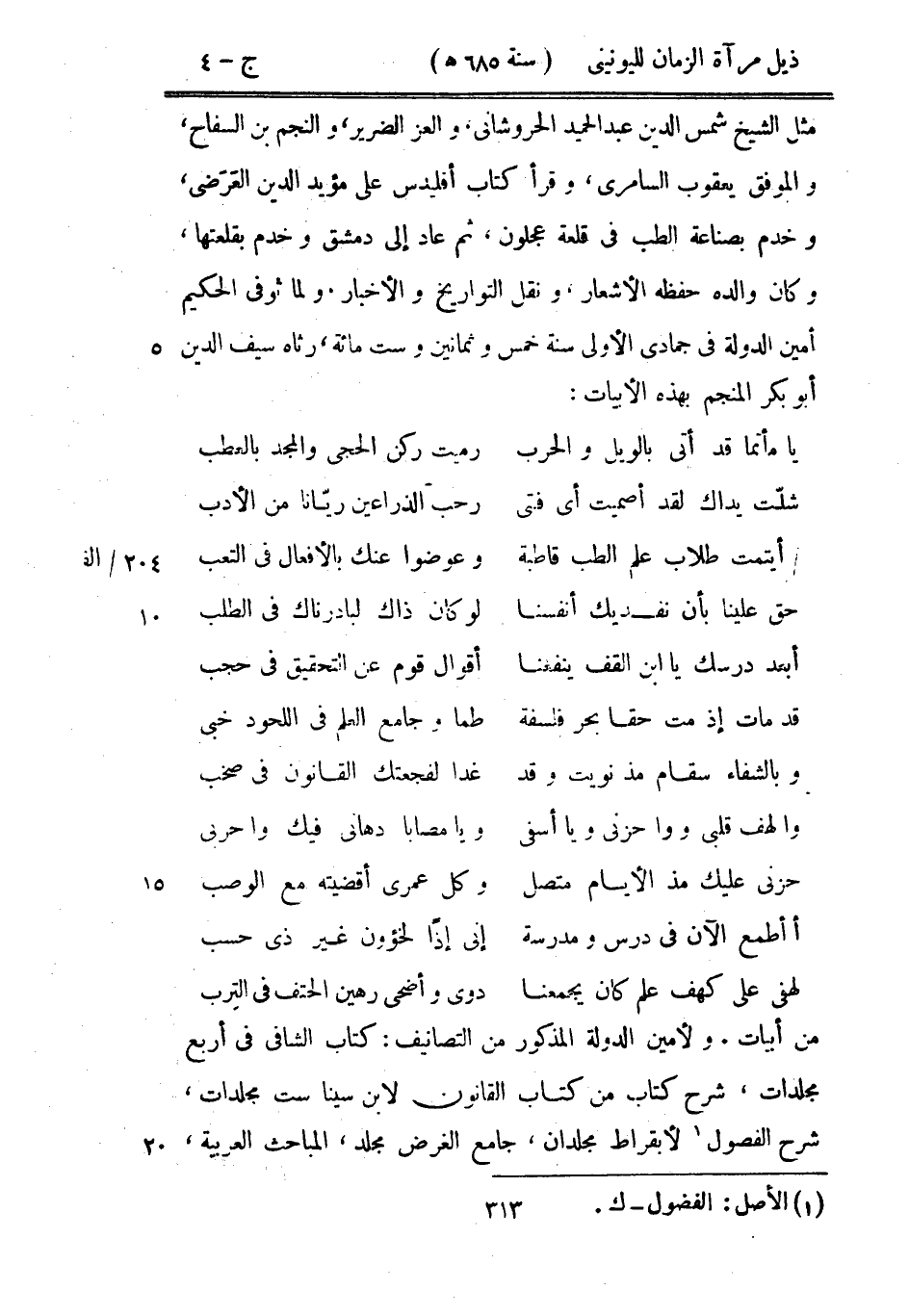 من أبيات. ولأمين الدولة المذكور من التصانيف: كتاب الشافي في أربع مجلدات، شرح كتاب من كتاب القانون لابن سينا ست مجلدات، شرح الفصول لأبقراط مجلدان، جامع الغرض مجلد، المباحث العربية،