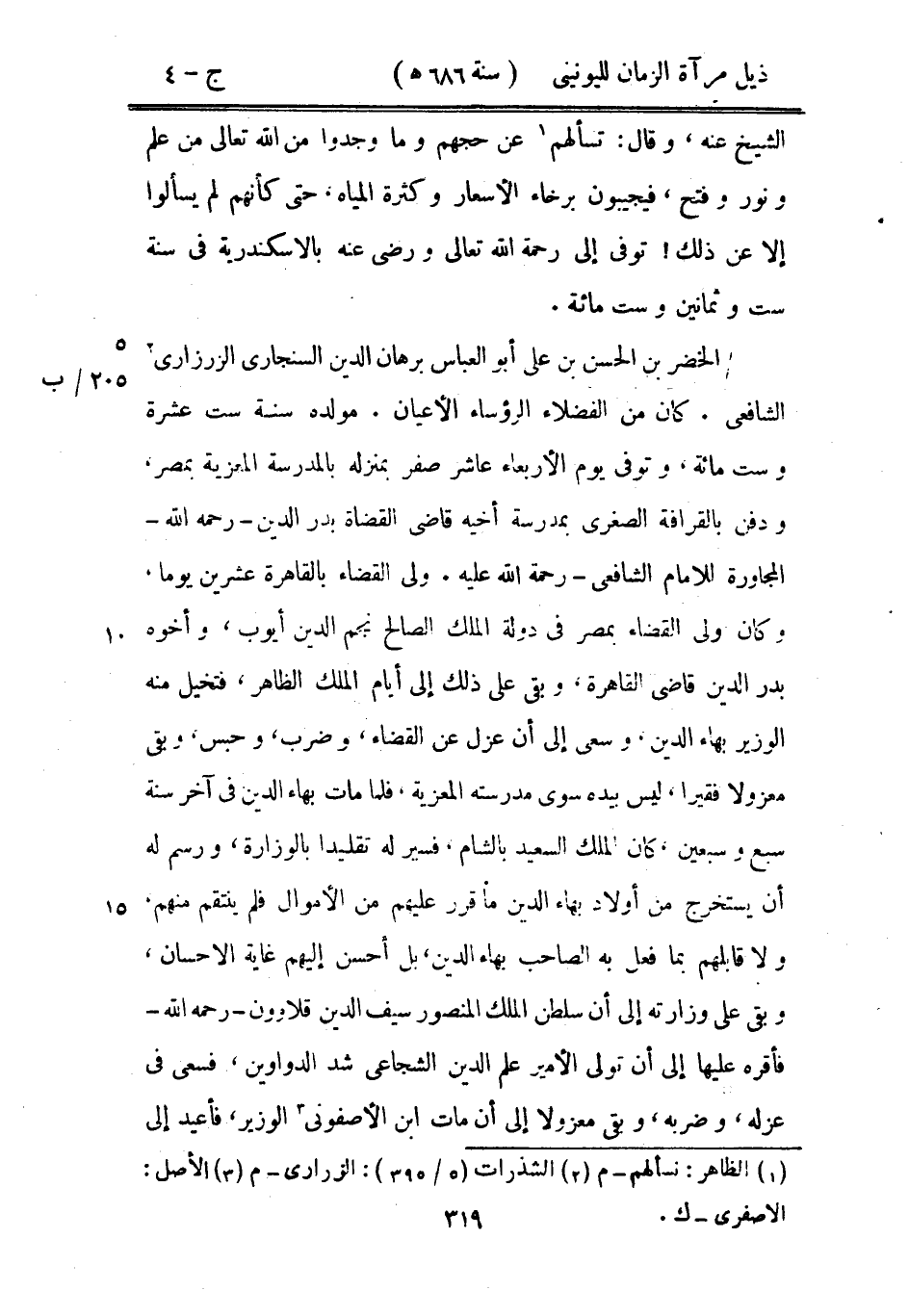 الخضر بن الحسن بن علي أبو العباس برهان الدين السنجاري الزرزاري الشافعي. كان من الفضلاء الرؤساء الأعيان. مولده سنة ست عشرة وست مائة، وتوفي يوم الأربعاء عاشر صفر بمنزله بالمدرسة المعزية بمصر، ودفن بالقرافة الصغرى بمدرسة أخيه قاضي القضاة بدر الدين رحمه الله المجاورة للإمام الشافعي رحمة الله عليه. ولي القضاء بالقاهرة عشرين يوماً، وكان ولي القضاء بمصر في دولة الملك الصالح نجم الدين أيوب، وأخوه بدر الدين قاضي القاهرة، وبقي على ذلك إلى أيام الملك الظاهر، فتخيل منه الوزير بهاء الدين، وسعى إلى أن عزل عن القضاء، وضرب، وحبس، وبقي معزولاً فقيراً، ليس بيده سوى مدرسته المعزيه. فلما مات بهاء الدين في آخر سنة سبع وسبعين، كان الملك السعيد بالشام، فسير له تقليداً بالوزارة، ورسم له أن يستخرج من أولاد بهاد الدين ما قرر عليهم من الأموال فلم ينتقم منهم، ولا قابلهم بما فعل به الصاحب بهاء الدين، بل أحسن إليهم غاية الإحسان، وبقي على وزارته إلى أن سلطن الملك المنصور سيف الدين قلاوون رحمه الله فأقره عليها إلى أن تولي الأمير علم الدين الشجاعي شد الدواوين، فسعى في عزله، وضربه، وبقي معزولاً إلى أن مات ابن الأصفوني الوزير، فأعيد إلى