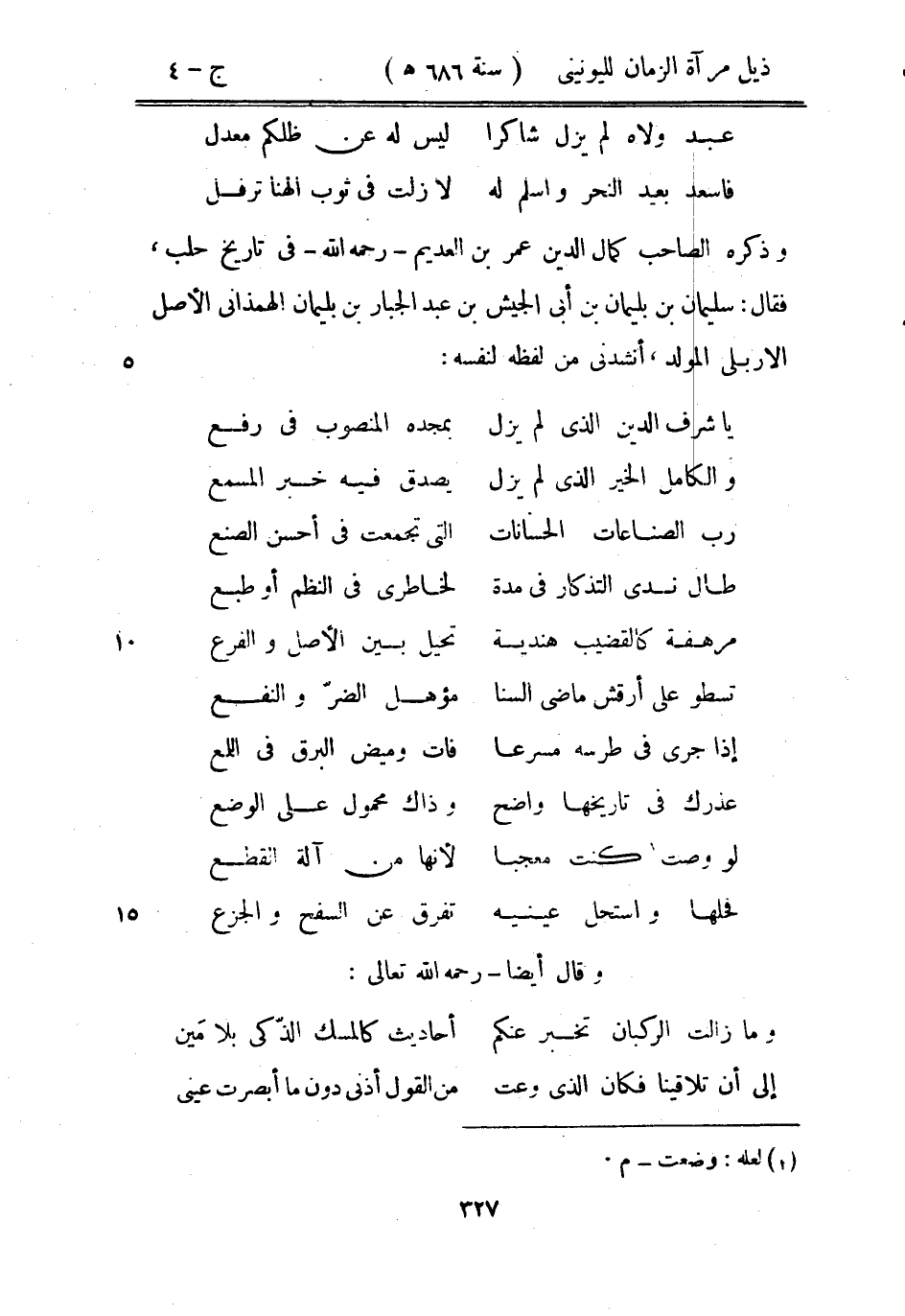 وذكره الصاحب كمال الدين عمر بن العديم رحمه الله في تاريخ حلب، فقال: سليمان بن بليمان بن أبي الجيش بن عبد الجبار بن بليمان الهمذاني الأصل الإربلي المولد، أنشدني من لفظه لنفسه: