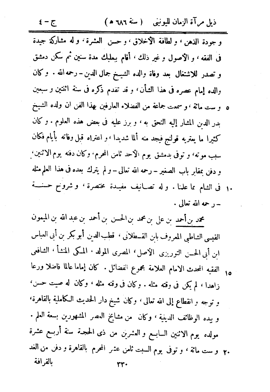 محمد بن أحمد بن علي بن محمد بن الحسن بن أحمد بن عبد الله بن الميمون القيسي الشاطبي المعروف بابن القسطلاني، قطب الدين أبو بكر بن أبي العباس ابن أبي الحسن التوريزي الأصل، المصري المولد، المكي المنشأ، الشافعي الفقيه المحدث الإمام العلامة مجموع الفضائل. كان إماماً عالماً فاضلاً ورعاً زاهداً، لم يكن في وقته مثله. وكان في وقته مثله، وكان له صيت حسن، وتوجه وانقطاع إلى الله تعالى، وكان شيخ دار الحديث الكاملية بالقاهرة، وبيده الوظائف الدينية، وكان من مشايخ العصر المشهورين بسعة العلم. مولده يوم الاثنين السابع والعشرين من ذي الحجة سنة أربع عشرة وست مائة، وتوفي يوم السبت ثامن عشر المحرم بالقاهرة ودفن من الغد