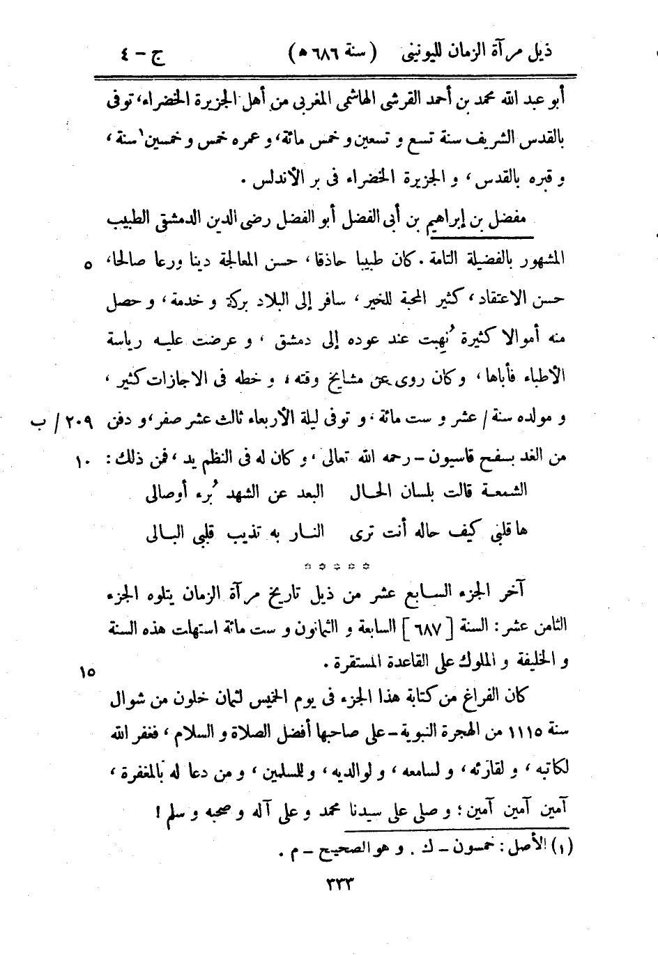 آخر الجزء السابع عشر من ذيل تاريخ مرآة الزمان يتلوه الجزء الثامن عشر: السنة السابعة والثمانون وست مائة استهلت هذه السنة والخليفة والملوك على القاعدة المستقرة.