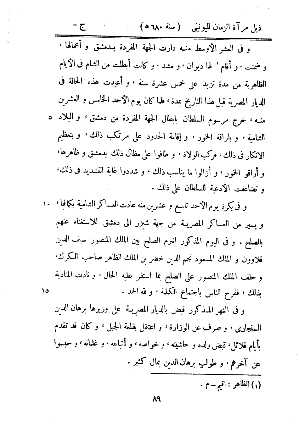 وفي بكرة يوم الأحد تاسع وعشرين منه عادت العساكر الشامية بكمالها، ويسير من العساكر المصرية من جهة سيزر إلى دمشق للاستغناء عنهم بالصلح. وفي اليوم المذكور انبرم الصلح بين الملك المنصور سيف الدين قلاوون والملك المسعود نجم الدين خضر بن الملك الظاهر صاحب الكرك، وحلف الملك المنصور على الصلح بما استقر عليه الحال، ونادت المنادية بذلك، ففرح الناس باجتماع الكلمة، ولله الحمد.