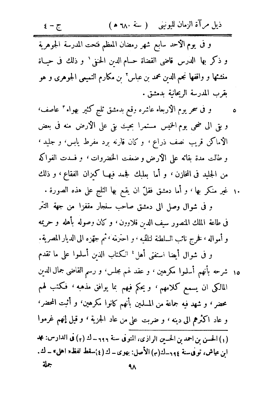 وفي سحر يوم الأربعاء عاشره وقع بدمشق ثلج كثير بهواء عاصف، وبقى إلى ضحى يوم الخميس مستمراً بحيث بقى على الأرض منه في بعض الأماكن قريب نصف ذراع، وكان قارنه برد مفرط يلبس، وجليد، وطالت مدة بقائه على الأرض وضعفت الخضروات، وفسدت الفواكه من الجليد في المخازن، وأما بعبلك فجمد فيها كيزان الفقاع، وذلك غير منكر بها، وأما دمشق فقل أن يقع بها الثلج على هذه الصورة.