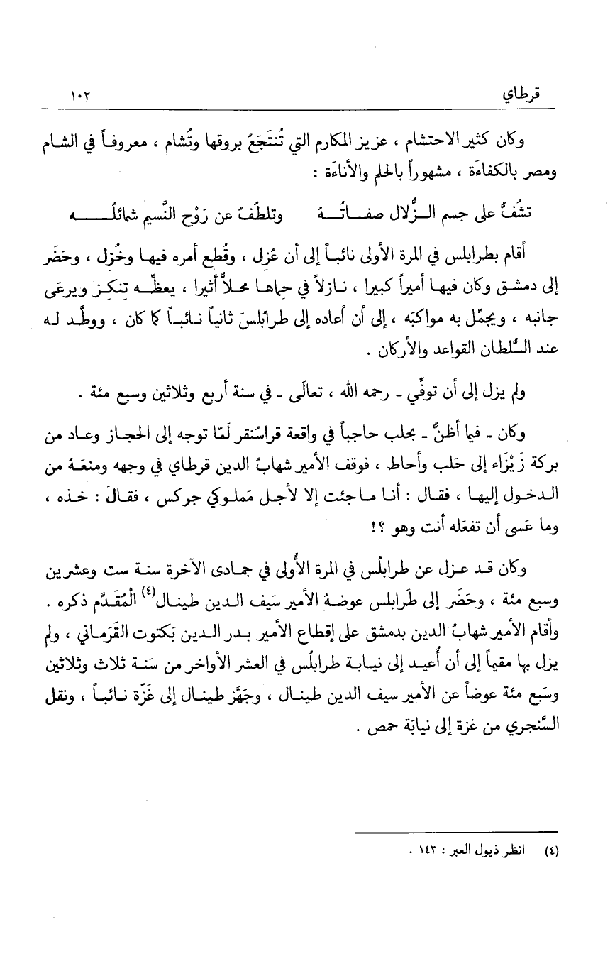 وكان - فيما أظن - بحلب حاجباً في واقعة قراسنقر لما توجه إلى الحجاز وعاد من بركة زيزاء إلى حلب وأحاط، فوقف الأمير شهاب الدين قرطاي في وجهه ومنعه من الدخول إليها، فقال: أنا ما جئت إلا لأجل مملوكي جركس، فقال: خذه، وما عسى أن تفعله أنت وهو؟! وكان قد عزل عن طرابلس في المرة الأولى في جمادى الآخرة سنة ست وعشرين وسبع مئة، وحضر إلى طرابلس عوضه الأمير سيف الدين طينال المقدم ذكره. وأقام الأمير شهاب الدين بدمشق على إقطاع الأمير بدر الدين بكتوت القرماني، ولم يزل بها مقيماً إلى أن أعيد إلى نيابة طرابلس في العشر الأواخر من سنة ثلاث وثلاثين وسبع مئة عوضاً عن الأمير سيف الدين طينال، وجهز طينال إلى غزة نائباً، ونقل السنجري من غزة إلى نيابة حمص.