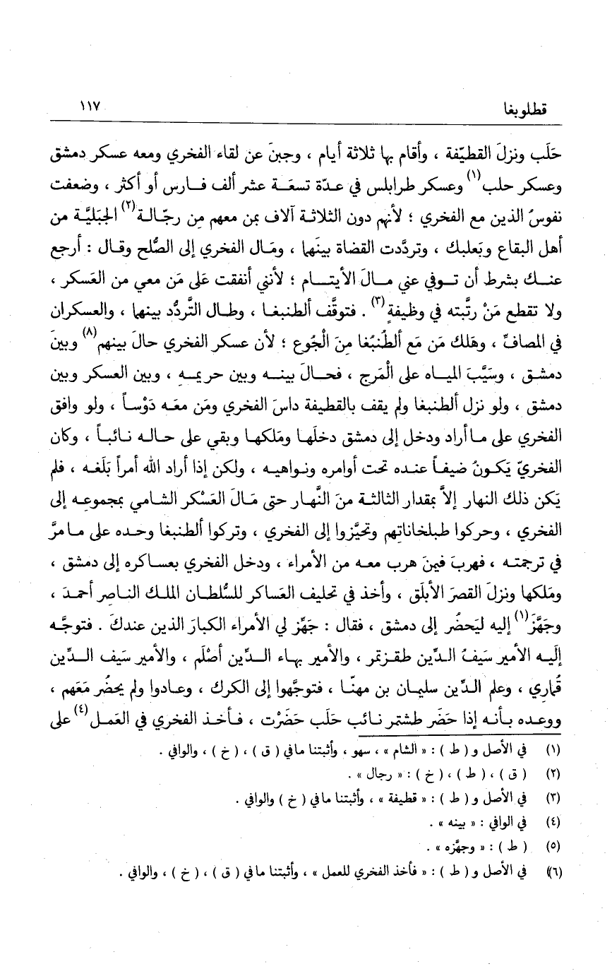 حلب ونزل القطيفة، وأقام بها ثلاثة أيام، وجبن عن لقاء الفخري ومعه عسكر دمشق وعسكر حلب وعسكر طرابلس في عدة تسعة عشر ألف فارس أو أكثر، وضعفت نفوس الذين مع الفخري؛ لأنهم دون الثلاثة آلاف بمن معهم من رجالة الجبلية من أهل البقاع وبعلبك، وترددت القضاة بينهما، ومال الفخري إلى الصلح وقال: أرجع عنك بشرط أن توفي عني مال الأيتام؛ لأنني أنفقت على من معي من العسكر، ولا تقطع من رتبته في وظيفة. فتوقف ألطنبغا، وطال التردد بينهما، والعسكران في المصاف، وهلك من مع ألطنبغا من الجوع؛ لأن عسكر الفخري حال بينهم وبين دمشق، وسيب المياه على المرج، فحال بينه وبين حريمه، وبين العسكر وبين دمشق، ولو نزل ألطنبغا ولم يقف بالقطيفة داس الفخري ومن معه دوساً، ولو وافق الفخري على ما أراد ودخل إلى دمشق دخلها وملكها وبقي على حاله نائباً، وكان الفخري يكون ضيفاً عنده تحت أوامره ونواهيه، ولكن إذا أراد الله أمراً بلغه، فلم يكن ذلك النهار إلا بمقدار الثالثة من النهار حتى مال العسكر الشامي بمجموعه إلى الفخري، وحركوا طبلخاناتهم وتحيزوا إلى الفخري، وتركوا ألطنبغا وحده على ما مر في ترجمته، فهرب فيمن هرب معه من الأمراء، ودخل الفخري بعساكره إلى دمشق، وملكها ونزل القصر الأبلق، وأخذ في تحليف العساكر للسلطان الملك الناصر أحمد، وجهز إليه ليحضر إلى دمشق، فقال: جهز لي الأمراء الكبار الذين عندك. فتوجه إليه الأمير سيف الدين طقزتمر، والأمير بهاء الدين أصلم، والأمير سيف الدين قماري، وعلم الدين سليمان بن مهنا، فتوجهوا إلى الكرك، وعادوا ولم يحضر معهم، ووعده بأنه إذا حضر طشتمر نائب حلب حضرت، فأخذ الفخري في العمل على
