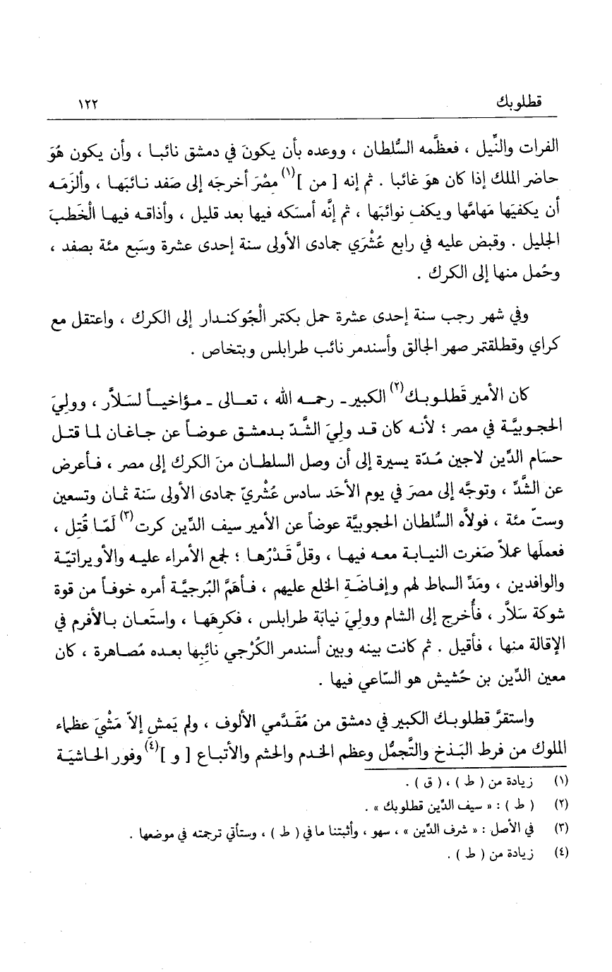 واستقر قطلوبك الكبير في دمشق من مقدمي الألوف، ولم يمش إلا مشي عظماء الملوك من فرط البذخ والتجمل وعظم الخدم والحشم والأتباع ووفور الحاشية