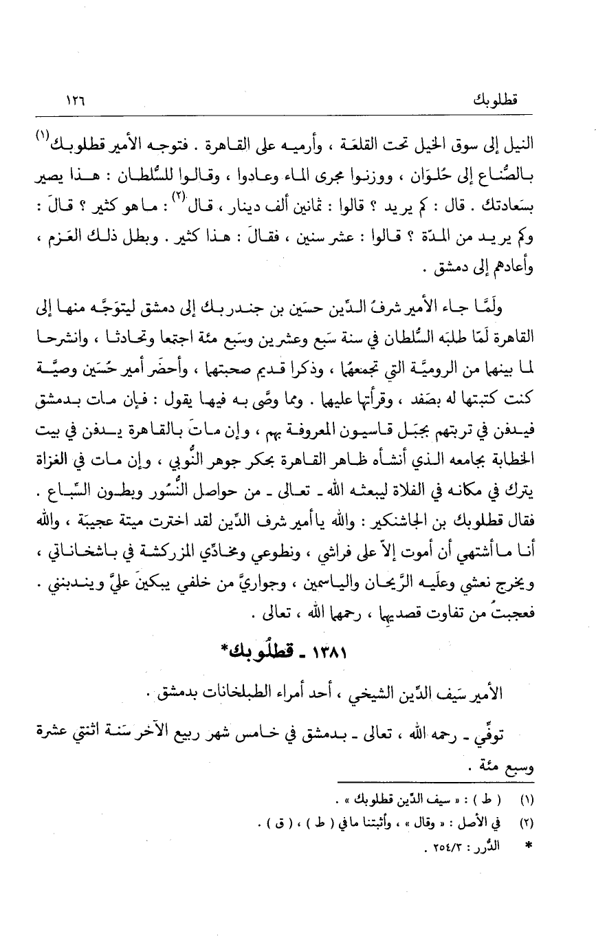 النيل إلى سوق الخيل تحت القلعة، وأرميه على القاهرة. فتوجه الأمير قطلوبك بالصناع إلى حلوان، ووزنوا مجرى الماء وعادوا، وقالوا للسلطان: هذا يصير بسعادتك. قال: كم يريد؟ قالوا: ثمانين ألف دينار، قال: ما هو كثير؟ قال: وكم يريد من المدة؟ قالوا: عشر سنين، فقال: هذا كثير. وبطل ذلك العزم، وأعادهم إلى دمشق.