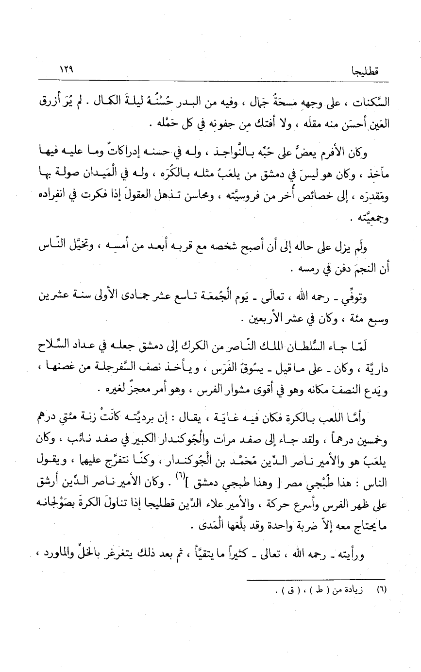 وأما اللعب بالكرة فكان فيه غاية، يقال: إن برديته كانت زنة مئتي درهم وخمسين درهماً، ولقد جاء إلى صفد مرات والجوكندار الكبير في صفد نائب، وكان يلعب هو والأمير ناصر الدين محمد بن الجوكندار، وكنا نتفرج عليهما، ويقول الناس: هذا طبجي مصر وهذا طبجي دمشق. وكان الأمير ناصر الدين أرشق على ظهر الفرس وأسرع حركة، والأمير علاء الدين قطليجا إذا تناول الكرة بصولجانه ما يحتاج معه إلا ضربة واحدة وقد بلغها المدى.