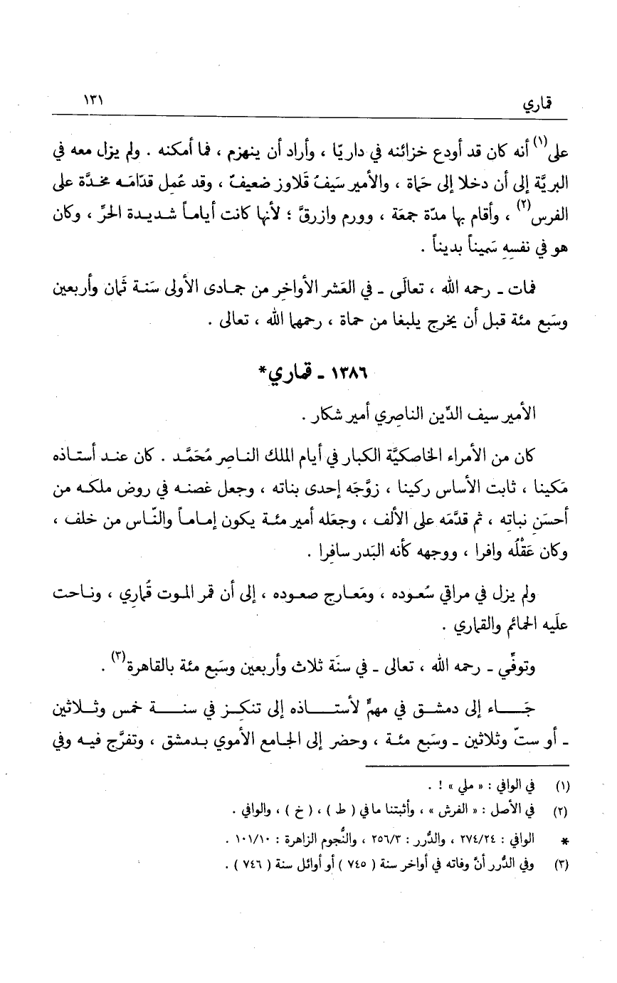 على أنه كان قد أودع خزائنه في داريا، وأراد أن ينهزم، فما أمكنه. ولم يزل معه في البرية إلى أن دخلا إلى حماة، والأمير سيف قلاوز ضعيف، وقد عمل قدامه مخدة على الفرس، وأقام بها مدة جمعة، وورم وازرق؛ لأنها كانت أيام شديدة الحر، وكان هو في نفسه سميناً بديناً.