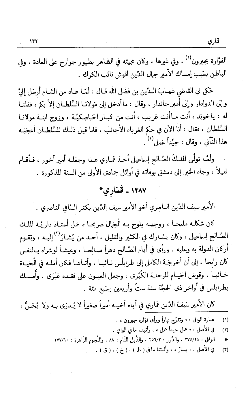 كان شكله مليحا، ووجهه يلوح به الجمال صريحا، عمل أستاذ دارية الملك الصالح إسماعيل، وكان يشارك في الكثير والقليل، أحد من يشار إليه، وتقوم أركان الدولة به وعليه. ورأى في أيام الصالح دهراً صالحا، وعيشاً لو شراه بالنفس كان رابحا، إلى أن أخرجه الكامل إلى طرابلس نائبا، وأتاها فكان أمله في الحياة خائبا، وقوض الخيام للرحلة الكبرى، وجعل العيون على فقده عبرى. وأمسك بطرابلس في أواخر ذي الحجة سنة ست وأربعين وسبع مئة.