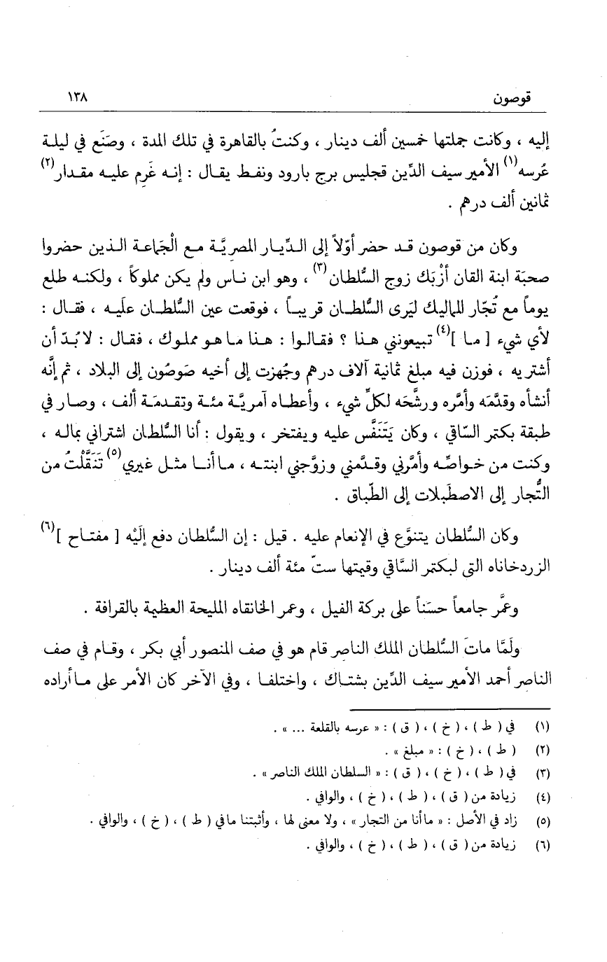 إليه، وكانت جملتها خمسين ألف دينار، وكنت بالقاهرة في تلك المدة، وصنع في ليلة عرسه الأمير سيف الدين قجليس برج بارود ونفط يقال: إنه غرم عليه مقدار ثمانين ألف درهم.
