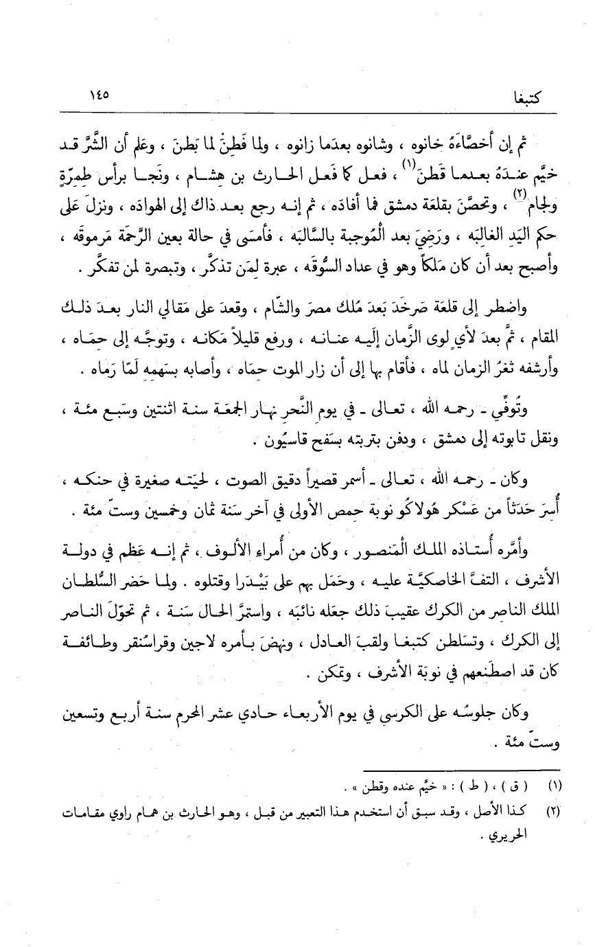 ثم إن أخصاءه خانوه، وشانوه بعدما زانوه، ولما فطن لما بطن، وعلم أن الشر قد خيم عنده بعدما قطن، فعل كما فعل الحارث بن هشام، ونجا برأس طمرة ولجام، وتحصن بقلعة دمشق فما أفاده، ثم إنه رجع بعد ذاك إلى الهواده، ونزل على حكم اليد الغالبه، ورضي بعد الموجبة بالسالبه، فأمسى في حالة بعين الرحمة مرموقه، وأصبح بعد أن كان ملكاً وهو في عداد السوقه، عبرة لمن تذكر، وتبصرة لمن تفكر.