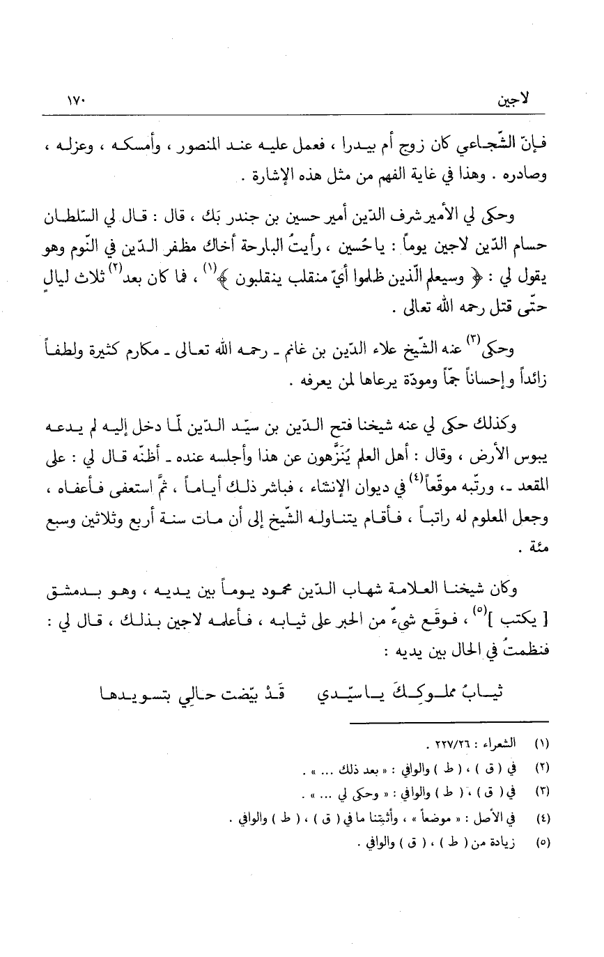 وحكى لي الأمير شرف الدين أمير حسين بن جندر بك، قال: قال لي السلطان حسام الدين لاجين يوماً: يا حسين، رأيت البارحة أخاك مظفر الدين في النوم وهو يقول لي: " وسيعلم الذين ظلموا أي منقلب ينقلبون "، فما كان بعد ثلاث ليال حتى قتل رحمه الله تعالى.