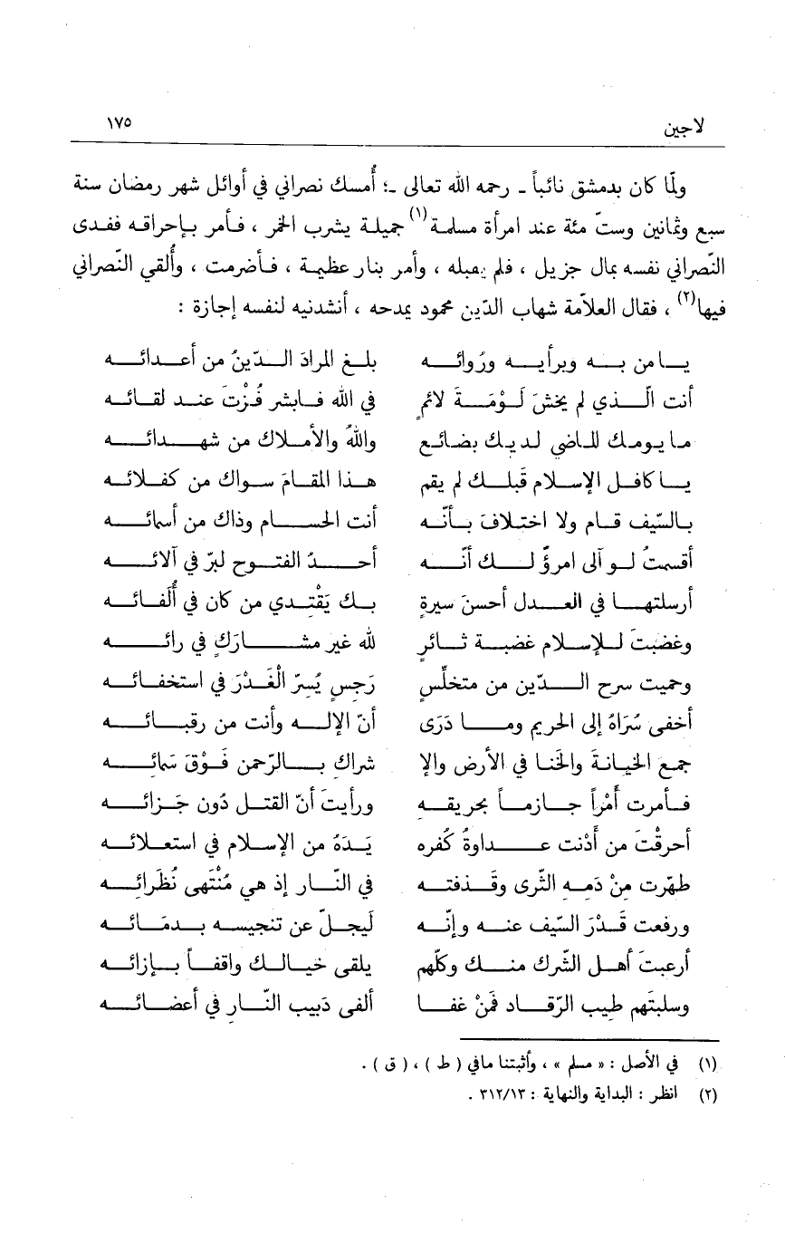 ولما كان بدمشق نائباً - رحمه الله تعالى -؛ أمسك نصراني في أوائل شهر رمضان سنة سبع وثمانين وست مئة عند امرأة مسلمة جميلة يشرب الخمر، فأمر بإحراقه ففدى النصراني نفسه بمال جزيل، فلم يقبله، وأمر بنار عظيمة، فأضرمت، وألقي النصراني فيها، فقال العلامة شهاب الدين محمود يمدحه، أنشدنيه لنفسه إجازة: