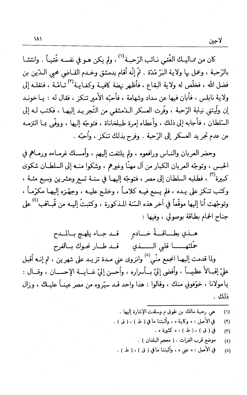 وحضر العربان والناس ورافعوه، ولم يلتفت إليهم، وأمسك غرماءه ورماهم في الحبس، وتوجه العربان الكبار من آل مهنا وغيرهم، وشكوا منه إلى السلطان شكوى كبيرة، فطلبه السلطان إلى مصر، فتوجه إليها في سنة تسع وعشرين وسبع مئة، وكتب تنكز على يده، فلم يسمع فيه كلاماً، وخلع عليه، وجهزه إليها مكرماً، وتوجهت أنا إليها موقعاً في آخر هذه السنة المذكورة، وكتبت إليه من قباقب على جناح الحمام بطاقة بوصولي، وفيها: