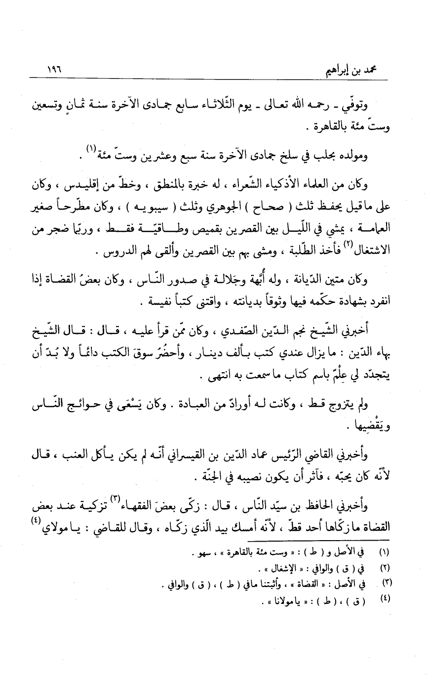 وكان من العلماء الأذكياء الشعراء، له خبرة بالمنطق، وخط من إقليدس، وكان على ما قيل يحفظ ثلث " صحاح " الجوهري وثلث " سيبويه "، وكان مطرحاً صغير العمامة، يمشي في الليل بين القصرين بقميص وطاقية فقط، وربما ضجر من الاشتغال فأخذ الطلبة، ومشى بهم بين القصرين وألقى لهم الدروس.