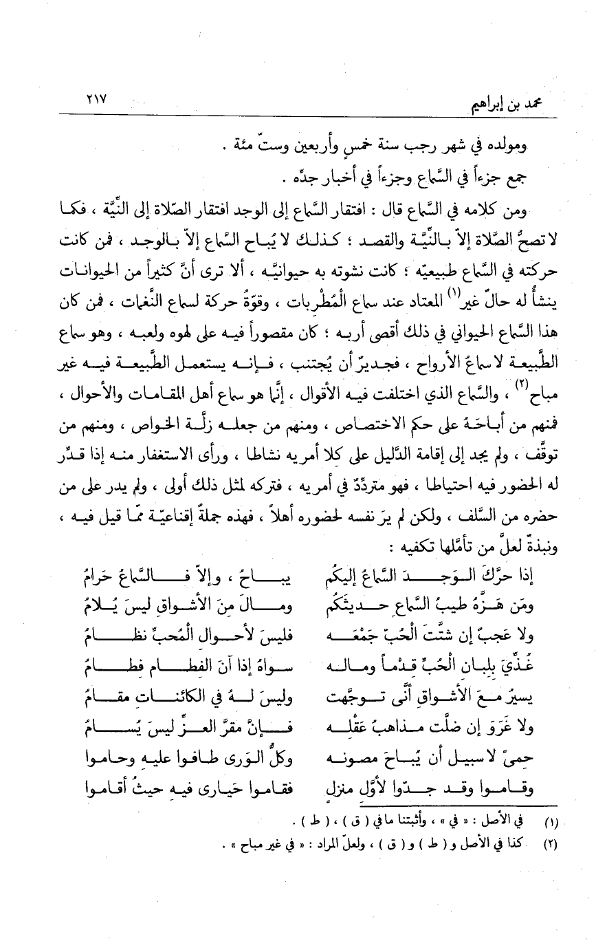 ومن كلامه في السماع قال: افتقار السماع إلى الوجد افتقار الصلاة إلى النية، فكما لا تصح الصلاة إلا بالنية والقصد؛ كذلك لا يباح السماع إلا بالوجد، فمن كانت حركته في السماع طبيعيه؛ كانت نشوته به حيوانيه، ألا ترى أن كثيراً من الحيوانات ينشأ له حال غير المعتاد عند سماع المطربات، وقوة حركة لسماع النغمات، فمن كان هذا السماع الحيواني في ذلك أقصى أربه؛ كان مقصوراً فيه على لهوه ولعبه، وهو سماع الطبيعة لا سماع الأرواح، فجدير أن يجتنب، فإنه يستعمل الطبيعة فيه غير مباح، والسماع الذي اختلفت فيه الأقوال، إنما هو سماع أهل المقامات والأحوال، فمنهم من أباحه على حكم الاختصاص، ومنهم من جعله زلة الخواص، ومنهم من توقف، ولم يجد إلى إقامة الدليل على كلا أمريه نشاطا، ورأى الاستغفار منه إذا قدر له الحضور فيه احتياطا، فهو متردد في أمريه، فتركه لمثل ذلك أولى، ولم يدر على من حضره من السلف، ولكن لم ير نفسه لحضوره أهلاً، فهذه جملة إقناعية مما قيل فيه، ونبذة لعل من تأملها تكفيه:
