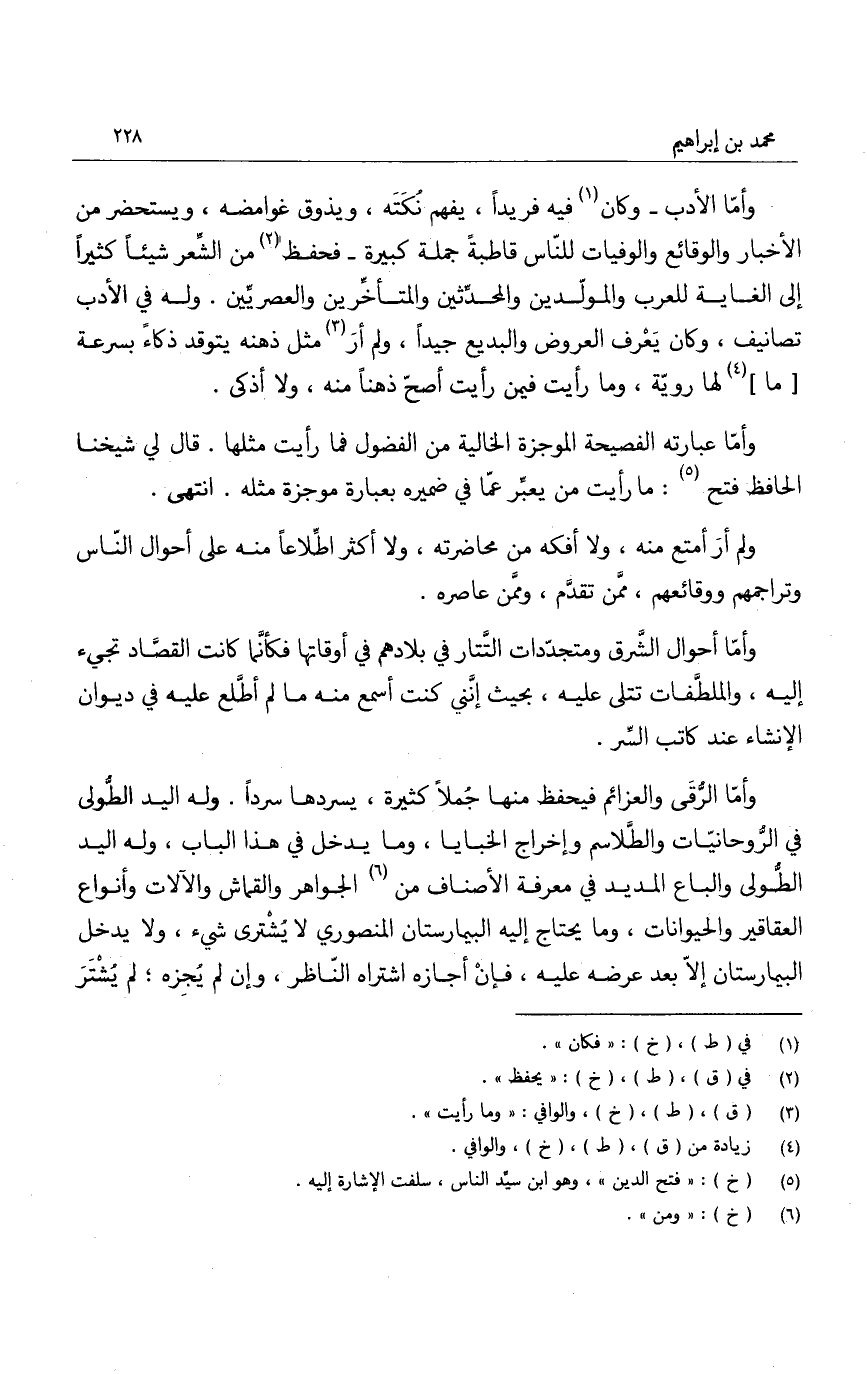 ولم أر أمتع منه، ولا أفكه من محاضرته، ولا أكثر اطلاعاً منه على أحوال الناس وتراجمهم ووقائعهم، ممن تقدم، وممن عاصره.