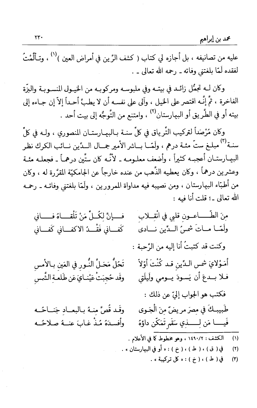 عليه من تصانيفه، بل أجازه لي كتاب " كشف الرين في أمراض العين "، وتألمت لفقده لما بلغتني وفاته - رحمه الله تعالى -.