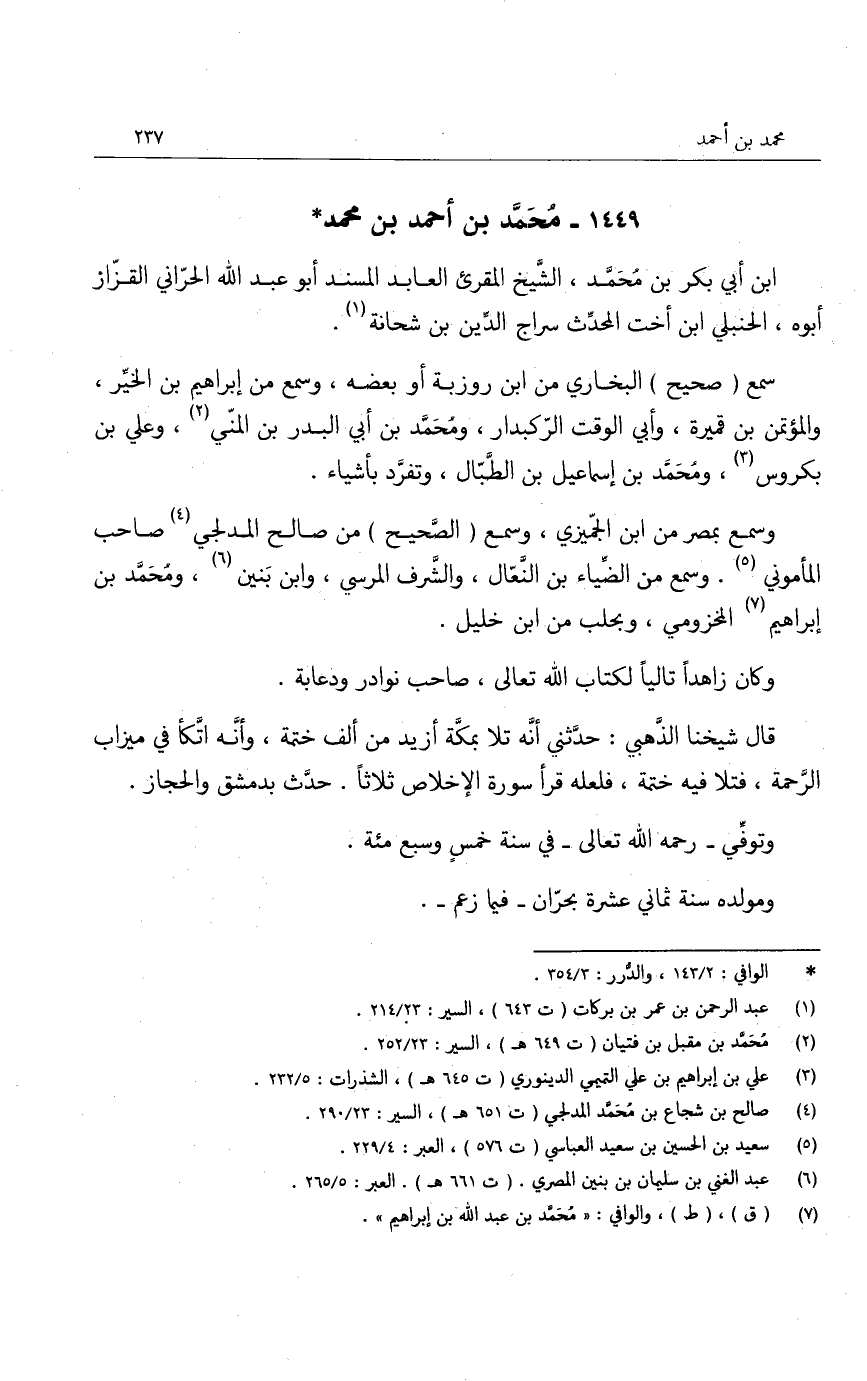 ابن أبي بكر بن محمد، الشيخ المقرئ العابد المسند أبو عبد الله الحراني القزاز أبوه، الحنبلي ابن أخت المحدث سراج الدين بن شحانة.
