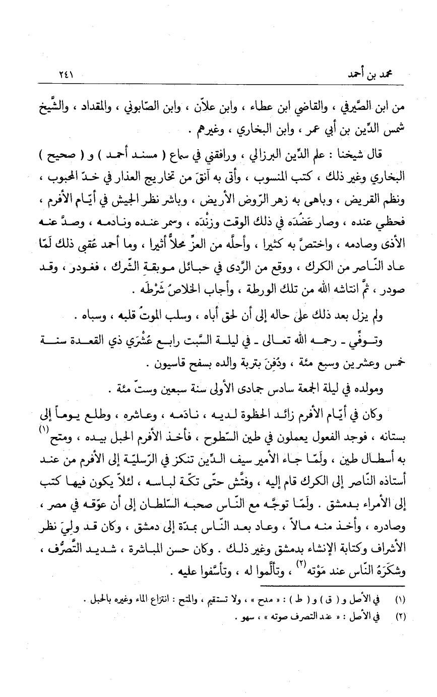 قال شيخنا: علم الدين البرزالي، ورافقني في سماع " مسند أحمد " و" صحيح " البخاري وغير ذلك، كتب المنسوب، وأتى به آنق من تخارج العذار في خد المحبوب، ونظم القريض، وباهى به زهر الروض الأريض، وباشر نظر الجيش في أيام الأفرم، فخظي عنده، وصار عضده في ذلك الوقت وزنده، وسمر عنده ونادمه، وصد عنه الأذى وصادمه، واختص به كثيرا، وأحله من العز محلاً أثيرا، وما أحمد عقبى ذلك لما عاد الناصر من الكرك، ووقع من الردى في حبائل موبقة الشرك، فغودر، وقد صودر، ثم انتاشه الله من تلك الورطة، وأجاب الخلاص شرطه.