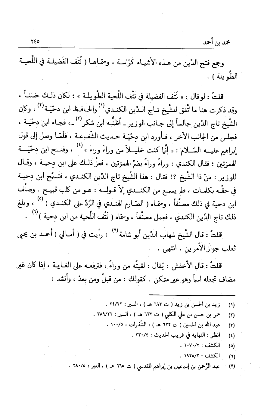قلت: لو قال: " نتف الفضيلة في نتف اللحية الطويلة "؛ لكان ذلك حسناً، وقد ذكرت هنا ما اتفق للشيخ تاج الدين الكندي والحافظ ابن دحية، وكان الشيخ تاج الدين جالساً إلى جانب الوزير - أظنه ابن شكر -، فجاء ابن دحية، فجلس من الجانب الآخر، فأورد ابن دحية حديث الشفاعة، فلما وصل إلى قول إبراهيم عليه السلام: " إنما كنت خليلاً من وراء وراء "، وفتح ابن دحية الهمزتين؛ فقال الكندي: وراء وراء بضم الهمزتين، فعز ذلك على ابن دحية، وقال للوزير: من ذا الشيخ؟! فقال: هذا الشيخ تاج الدين الكندي، فتسمح ابن دحية في حقه بكلمات، فلم يسمع الكندي إلا قوله: هو من كلب قبيح. وصنف ابن دحية في ذلك مصنفاً، وسماه " الصارم الهندي في الرد على الكندي "، وبلغ ذلك تاج الدين الكندي، فعمل مصنفاً، وسماه " نتف اللحية من ابن دحية ".