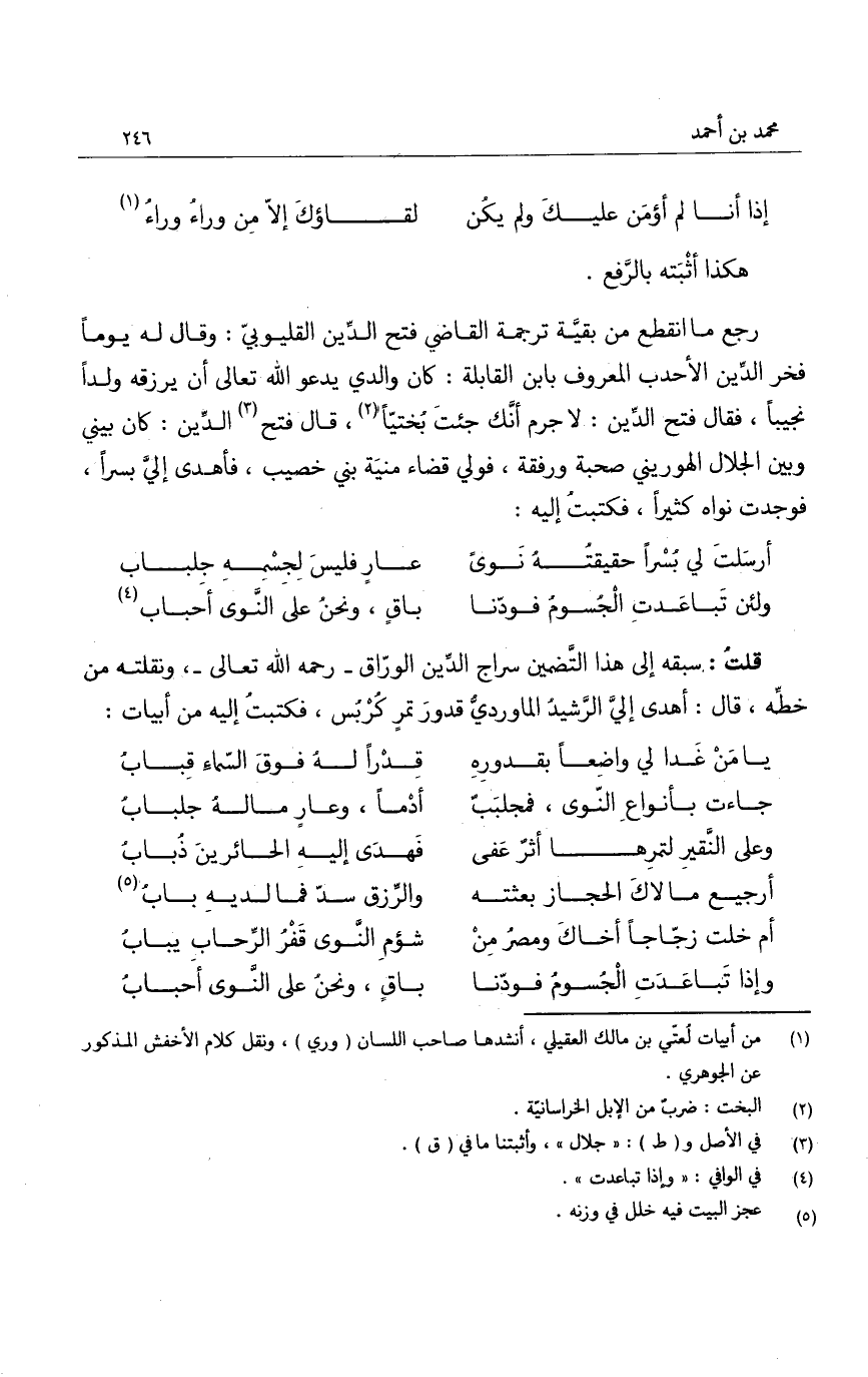 رجع ما انقطع من بقية ترجمة القاضي فتح الدين القليوبي: وقال له يوماً فخر الدين الأحدب المعروف بابن القابلة: كان والدي يدعو الله تعالى أن يرزقه ولداً نجيباً، فقال فتح الدين: لا جرم أنك جئت بختياً، قال فتح الدين: كان بيني وبين الجلال الهوريني صحبة ورفقة، فولي قضاء منية بني خصيب، فأهدى إلى بسراً، فوجدت نواه كثيراً، فكتبت إليه: