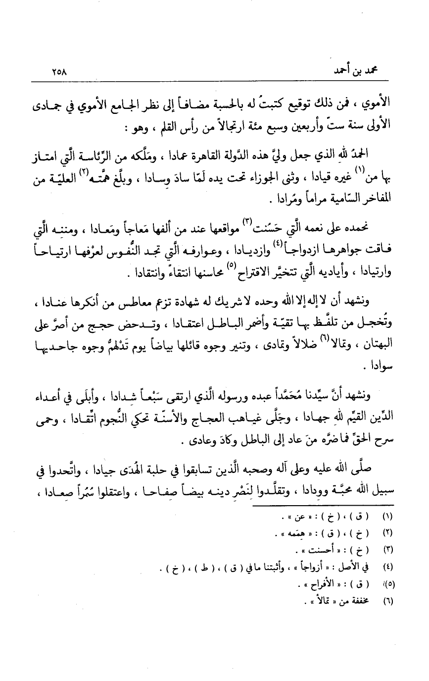 الأموي، فمن ذلك توقيع كتبت له بالحسبة مضافاً إلى نظر الجامع الأموي في جمادى الأولى سنة ست وأربعين وسبع مئة ارتجالاً من رأس القلم، وهو: الحمد لله الذي جعل ولي هذه الدولة القاهرة عماداً، وملكه من الرئاسة التي امتاز بها من غيره قياداً، وثنى الجوزاء تحت يده لما ساد وساداً، وبلغ همته العلية من المفاخر السامية مراماً ومراداً.