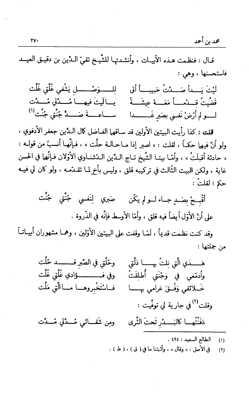 قلت: كذا رأيت البيتين الأولين قد ساقهما الفاضل كمال الدين جعفر الأدفوي، ولو أن فيهما حكماً، لقلت: " اصبر إذا ما حالة حلت "، فإنها أنسب من قوله: " حادثة أقبلت "، وأما بيتا الشيخ تاج الدين الدشناوي الأولان فإنهما في الحسن غاية، ولكن البيت الثالث في تركيبه قلق، وليس بأخ لما تقدمه، ولو كان لي فيه حكم؛ لقلت: