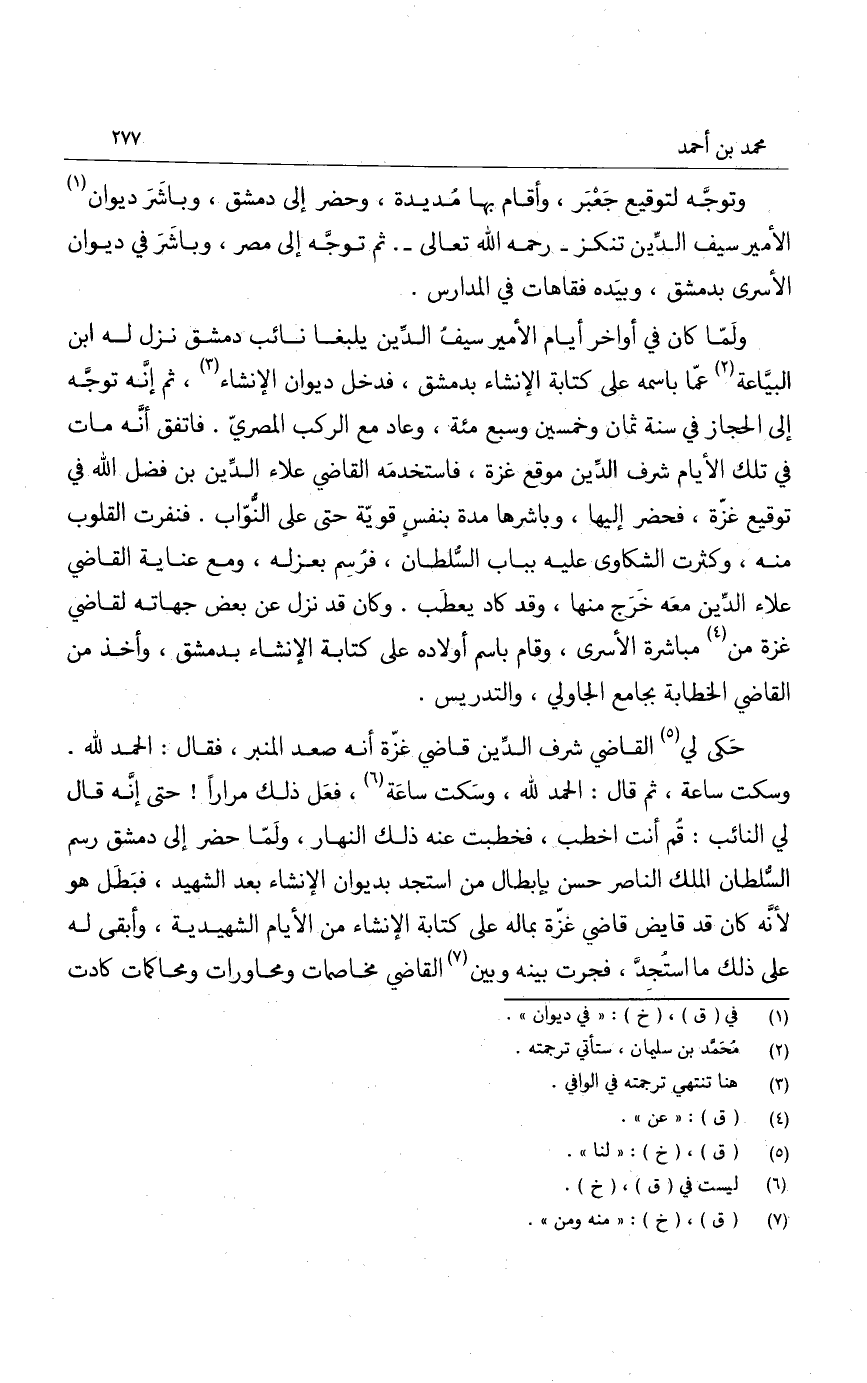 حكى لي القاضي شرف الدين قاضي غزة أنه صعد المنبر، فقال: الحمد لله، وسكت ساعة، ثم قال: الحمد لله، وسكت ساعة، فعل ذلك مراراً! حتى إنه قال لي النائب: قم أنت اخطب، فخطبت عنه ذلك النهار، ولما حضر إلى دمشق رسم السلطان الملك الناصر حسن بإبطال من استجد بديوان الإنشاء بعد الشهيد، فبطل هو لأنه كان قد قايض قاضي غزة بماله على كتابة الإنشاء من الأيام الشهيدية، وأبقى له على ذلك ما استجد، فجرت بينه وبين القاضي مخاصمات ومحاورات ومحاكمات كادت