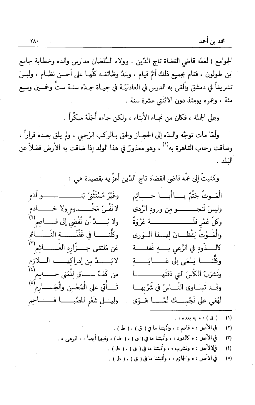 وكتبت إلى عمه قاضي القضاة تاج الدين أعزيه بقصيدة هي: