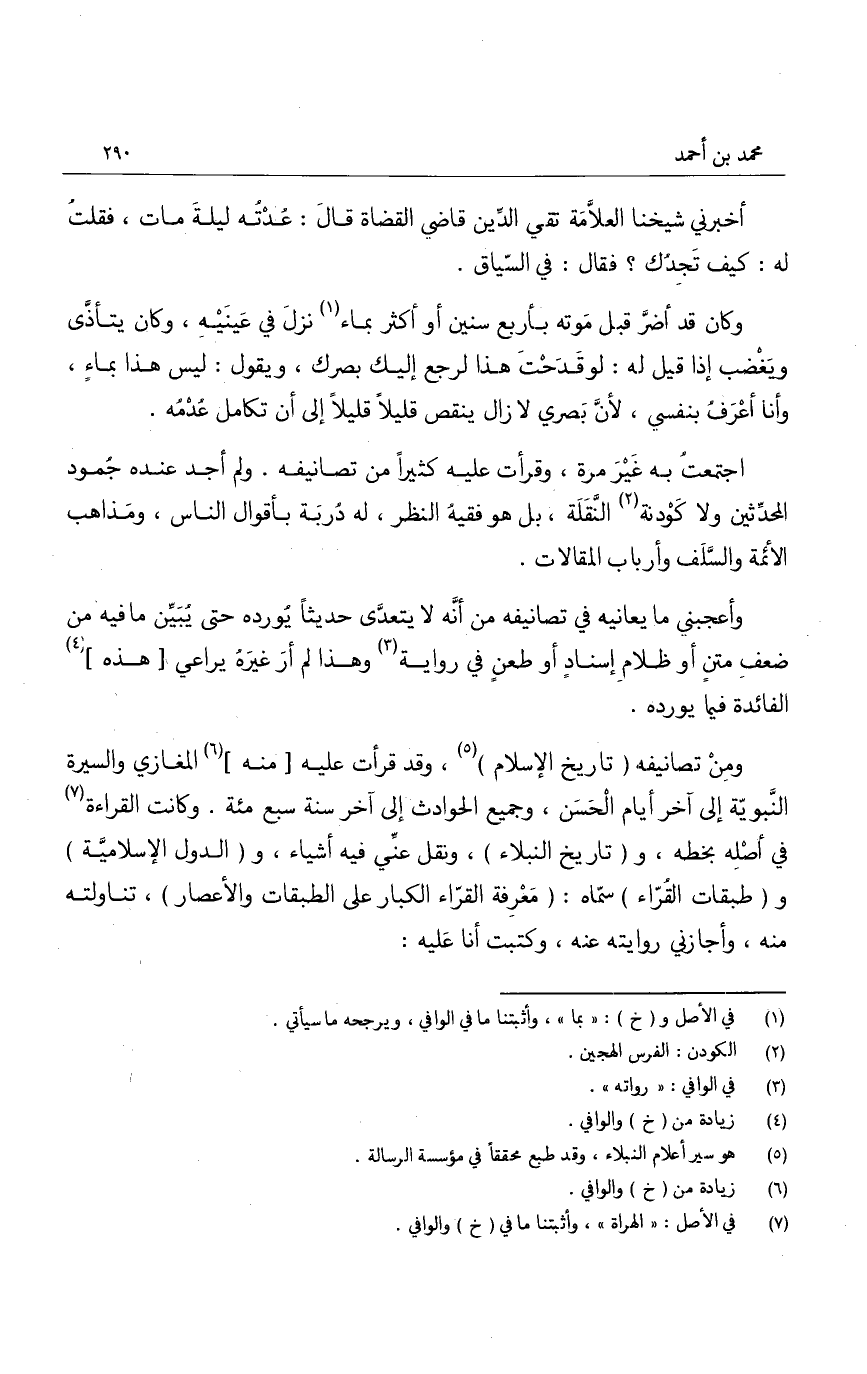 ومن تصانيفه " تاريخ الإسلام "، وقد قرأت عليه منه المغازي والسيرة النبوية إلى آخر أيام الحسن، وجميع الحوادث إلى آخر سنة سبع مئة. وكانت القراءة في أصله بخطه، و" تاريخ النبلاء "، ونقل عني فيه أشياء، و" الدول الإسلامية " و" طبقات القراء " سماه: " معرفة القراء الكبار على الطبقات والأعصار "، تناولته منه، وأجازني روايته عنه، وكتبت أنا عليه: