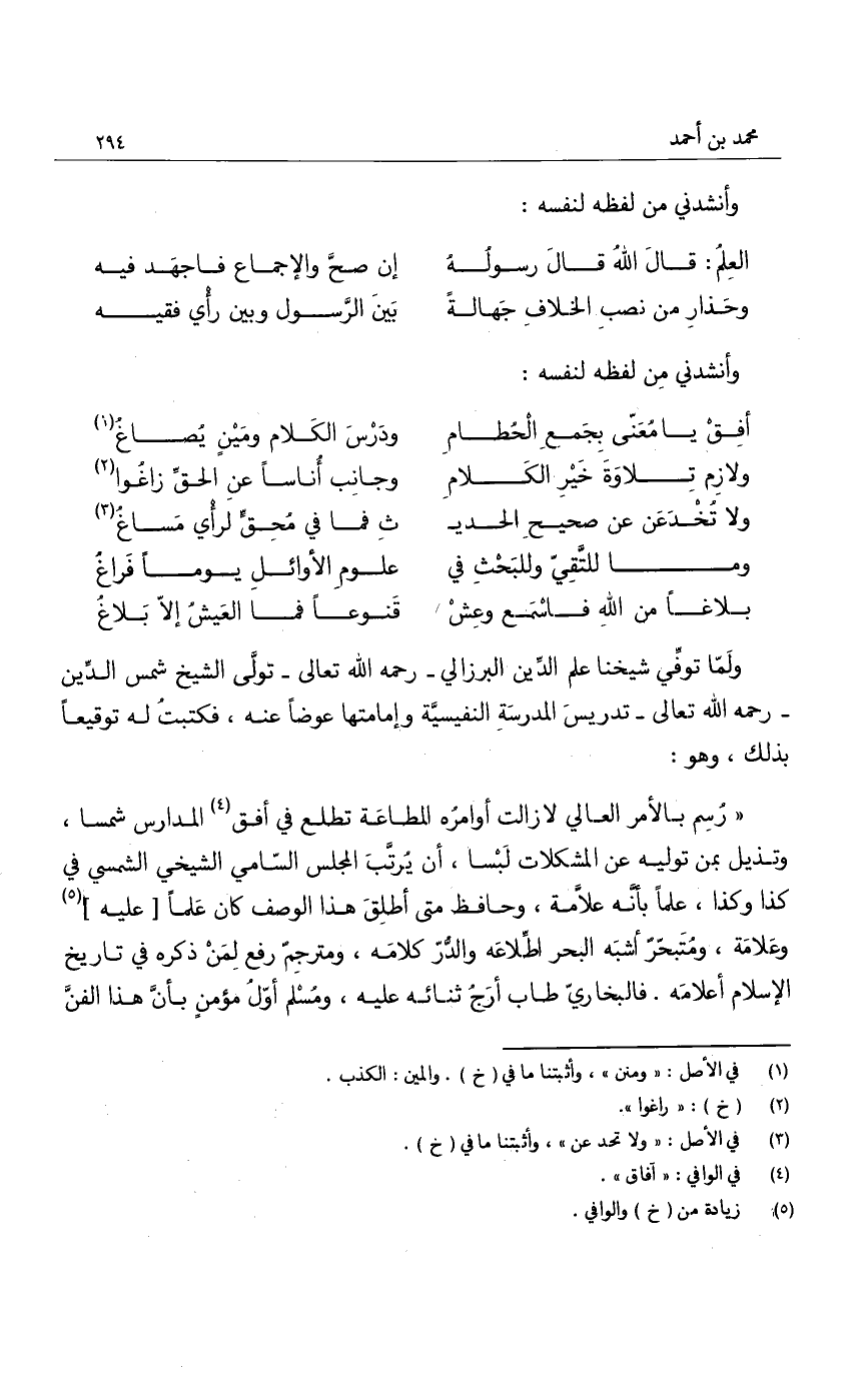 ولما توفي شيخنا علم الدين البرزالي - رحمه الله تعالى - تولى الشيخ شمس الدين - رحمه الله تعالى - تدريس المدرسة النفيسية وإمامتها عوضاً عنه، فكتبت له توقيعاً بذلك، وهو: " رسم بالأمر العالي لا زالت أوامره المطاعة تطلع في أفق المدارس شمسا، وتذيل بمن توليه عن المشكلات لبسا، أن يرتب المجلس السامي الشيخي الشمس في كذا وكذا، علماً بأنه علامة، وحافظ متى أطلق هذا الوصف كان علماً عليه وعلامة، ومتبحر أشبه البحر إطلاعه والدر كلامه، ومترجم رفع لمن ذكره في تاريخ الإسلام أعلامه، فالبخاري طاب أرج ثنائه عليه، ومسلم أول مؤمن بأن هذا الفن