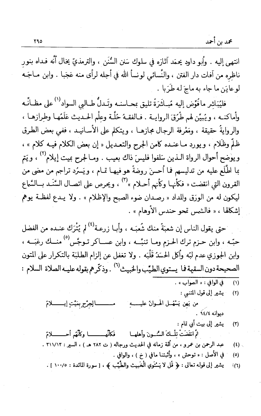 انتهى إليه. وأبو داود يحمد آثاره في سلوك سنن السنن، والترمذي يخال أنه فداه بنور ناظره من آفات دار الفتن، والنسائي لو نسأ الله في أجله لرأى منه عجبا. وابن ماجه لو عاين ما جاء به ماج له طربا.