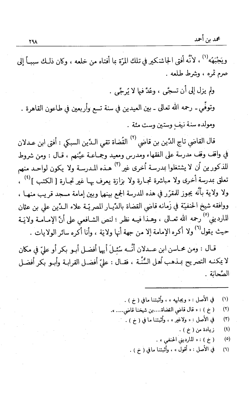 قال القاضي تاج الدين بن قاضي القضاة تقي الدين السبكي: أفتى ابن عدلان في واقف وقف مدرسة على الفقهاء ومدرس ومعيد وجماعة عينهم، قال: ومن شروط المذكورين أن لا يشتغلوا بمدرسة أخرى غير هذه المدرسة ولا يكون لواحد منهم تعلق بمدرسة أخرى ولا مباشرة تجارة ولا بزازة يعرف بها غير تجارة الكتب، ولا ولاية بأنه يجوز للمقرر في هذه المدرسة الجمع بينهما وبين إمامة مسجد قريب منها، ووافقه شيخ الحنفية في زمانه قاضي القضاة بالديار المصرية علاء الدين علي بن عثمان المارديني رحمه الله تعالى، وهذا فيه نظر؛ لنص الشافعي على أن الإمامة ولاية حيث يقول ولا أكره الإمامة إلا من جهة أنها ولاية، وأنا أكره سائر الولايات.