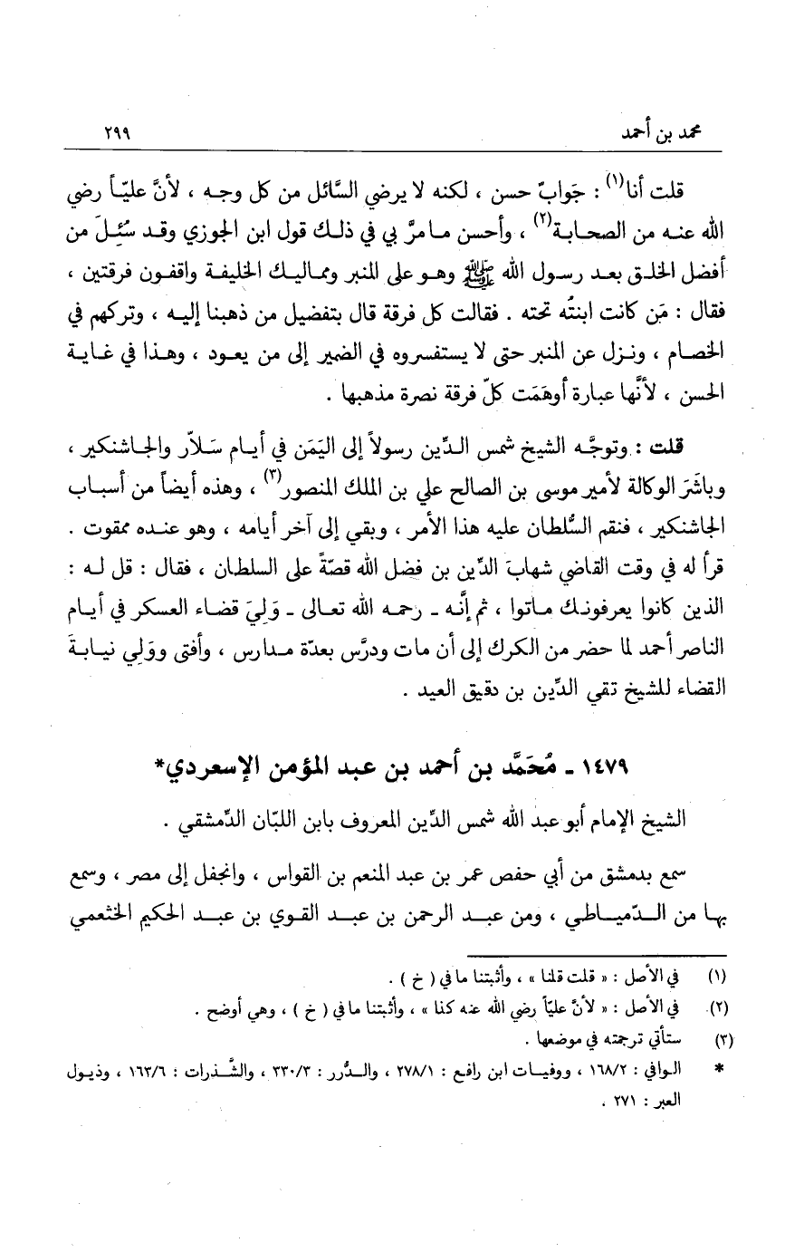 قلت أنا: جواب حسن، لكنه لا يرضي السائل من كل وجه، لأن علياً رضي الله عنه من الصحابة، وأحسن ما مر بي في ذلك قول ابن الجوزي وقد سئل من أفضل الخلق بعد رسول الله صَلَّى اللهُ عَلَيْهِ وَسَلَّمَ وهو على المنبر ومماليك الخليفة واقفون فرقتين، فقال: من كانت ابنته تحته. فقالت كل فرقة قال بتفضيل من ذهبنا إليه، وتركهم في الخصام، ونزل عن المنبر حتى لا يستفسروه في الضمير إلى من يعود، وهذا في غاية الحسن، لأنها عبارة أوهمت كل فرقة نصرة مذهبها.